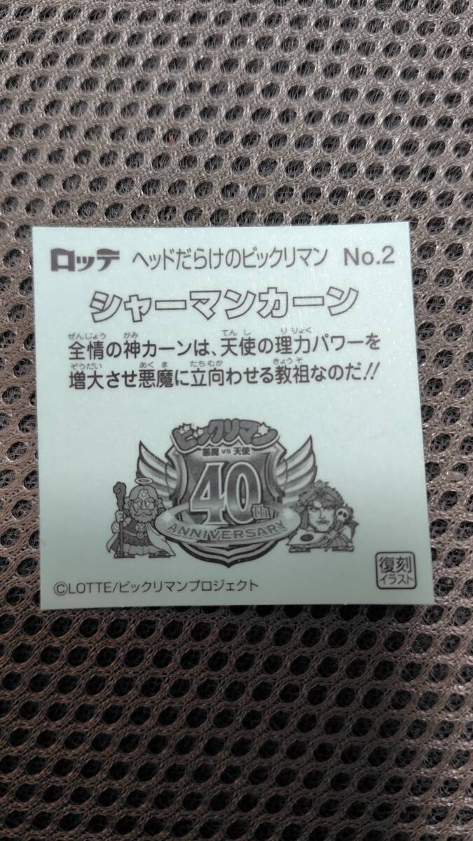 ビックリマン 40th  ヘッドだらけのビックリマン No.2  シャーマンカーン  です。状態は写真で判断して下さい。詳しく知りたい方は質問でお願いします。旧ビックリマン、ひかり伝、聖核伝、ビックリマン伝説を大量出品していますので、他もご覧下さい。発送は普通郵便(110円~)のみになります。ノークレームノーリターンでお願いします。