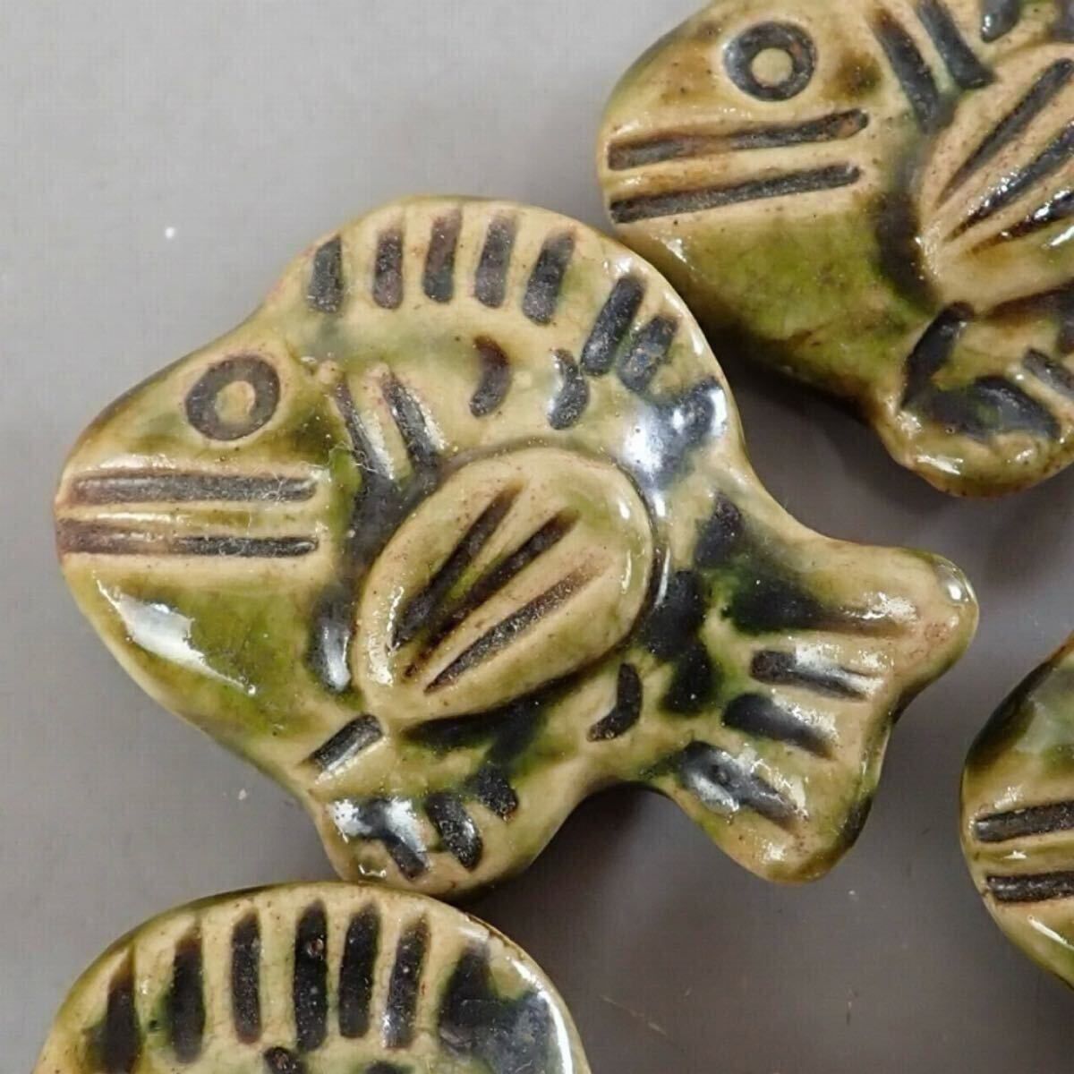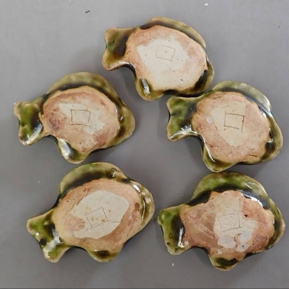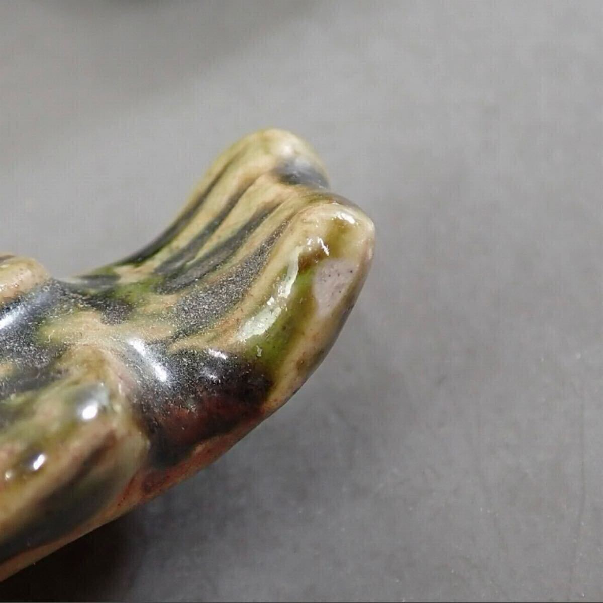 北大路魯山人による魚型の箸置き5客揃いです。大胆かつユーモラスな造形と、織部釉の力強いコントラストが印象的な作品です。素朴でありながら洗練されたフォルムは、魯山人ならではの造形美を感じさせ、食卓に遊び心と格調を添えてくれます。裏面には魯山人作品にしばしば見られるロの刻印が施されています。