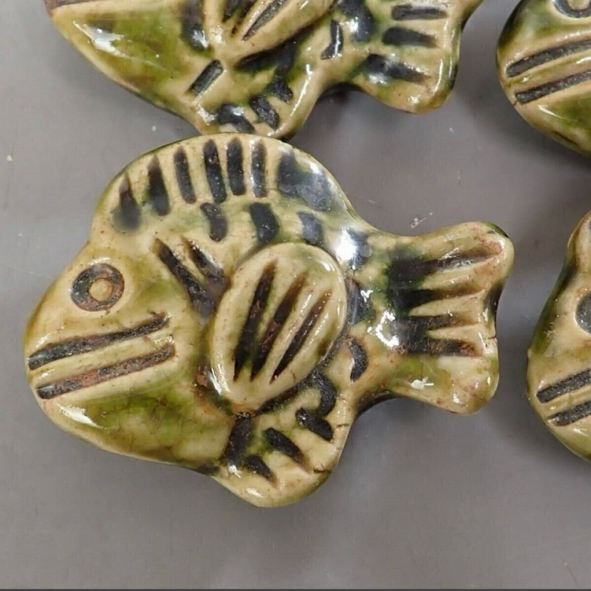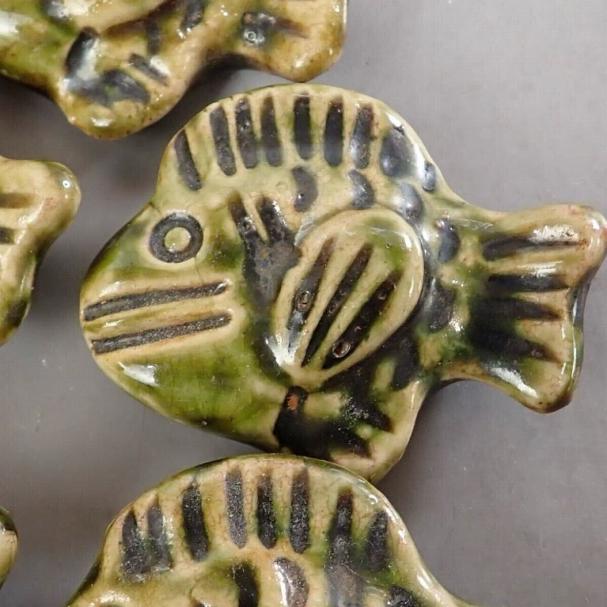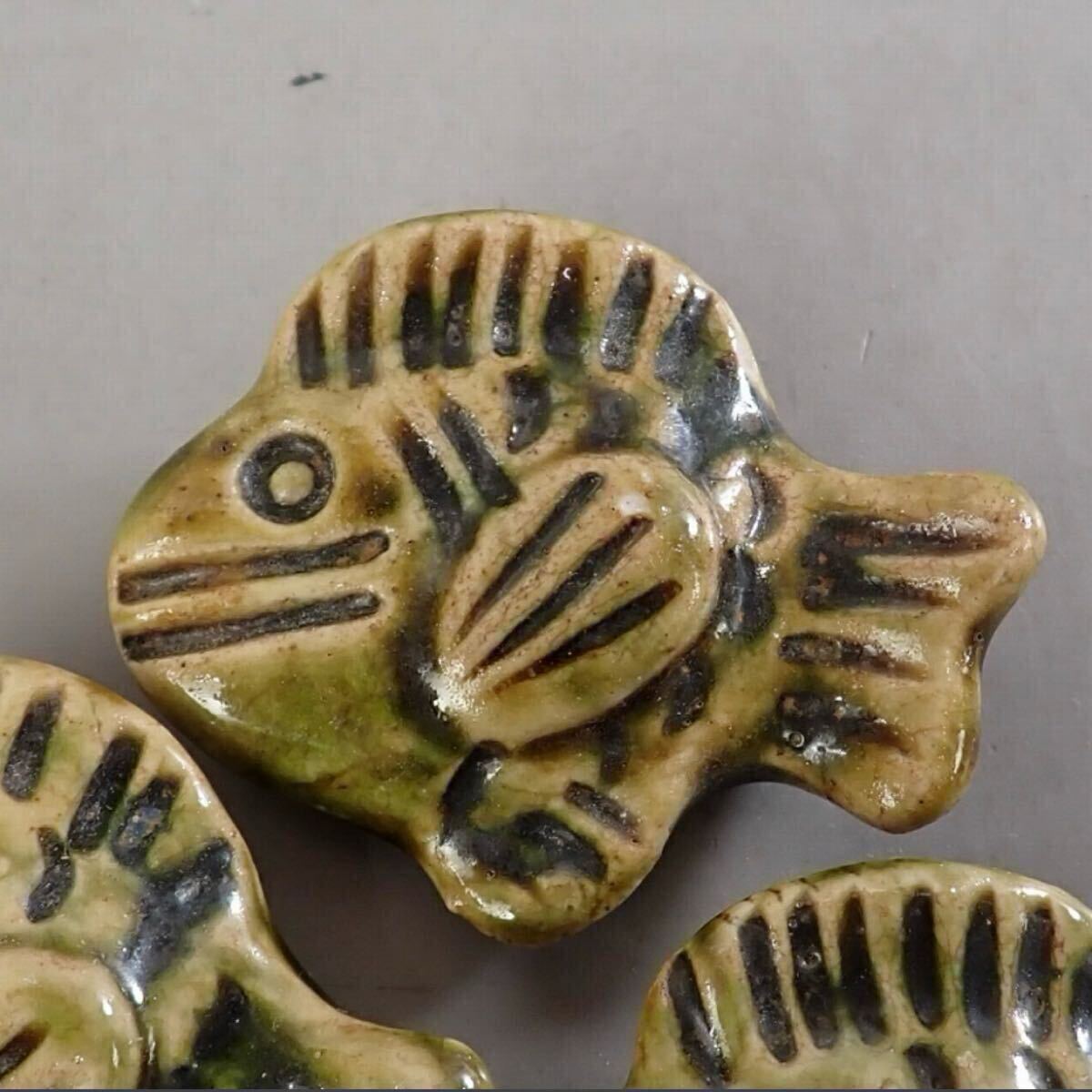 北大路魯山人による魚型の箸置き5客揃いです。大胆かつユーモラスな造形と、織部釉の力強いコントラストが印象的な作品です。素朴でありながら洗練されたフォルムは、魯山人ならではの造形美を感じさせ、食卓に遊び心と格調を添えてくれます。裏面には魯山人作品にしばしば見られるロの刻印が施されています。