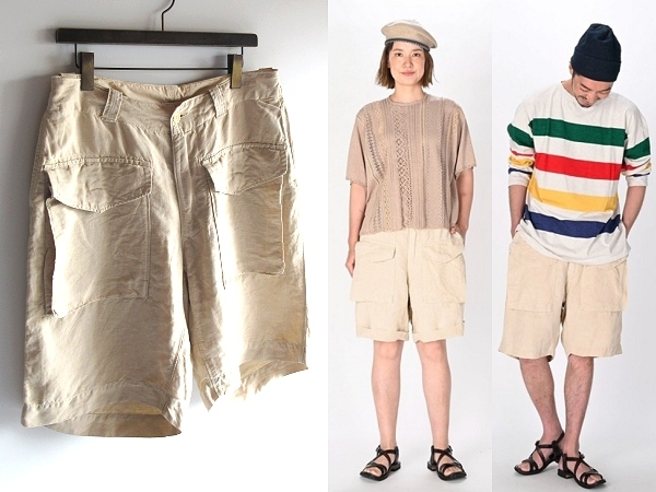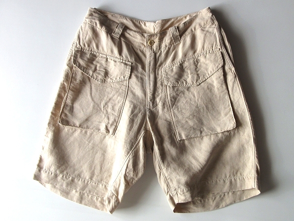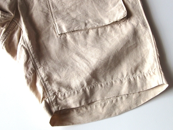 45Rのショートパンツ。ドライタッチのリネン生地を使用。ヨットマンが船上で座っているまま使えるように膝上に大きなポケットをつけました。お尻部分の当て布もそんな背景を感じられるデザインです。上質な素材使いと綺麗なシルエットで、様々なコーディネートにお使い頂ける一着です。