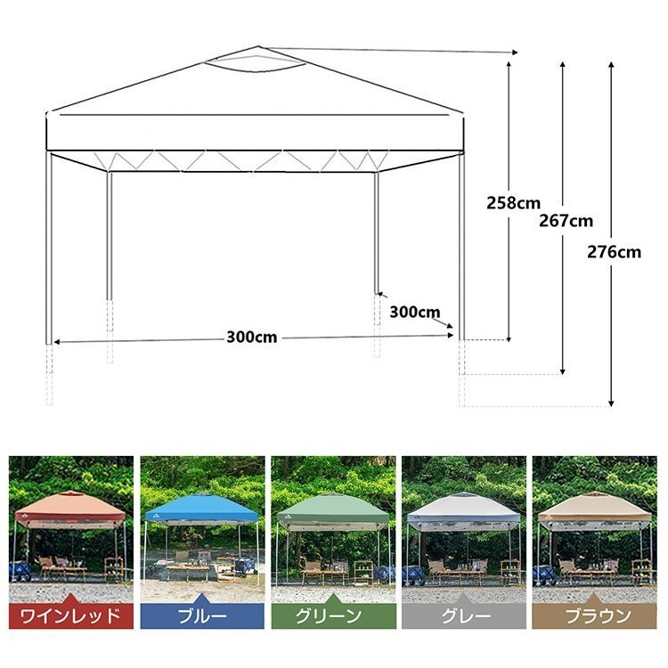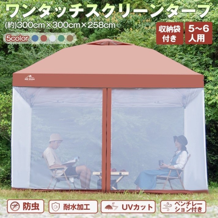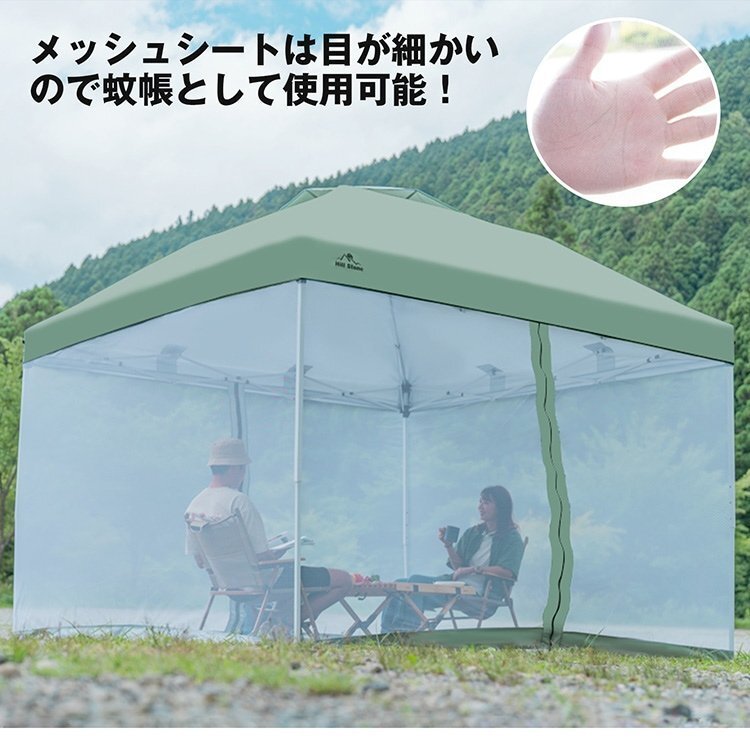 タープテント タープ&メッシュシートセット 3×3m 5~6人用 ワンタッチ 防虫 耐水加工 UVカット 収納袋付き 高さ3段階調節 2 人組立可 鉄製