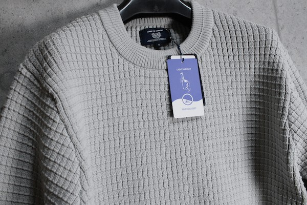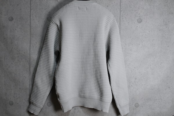 《デザイン》 ミドルゲージ(7GG)のワッフル柄で編み立てた、シンプルなクルーネックニット。 袖口と裾のリブうえに入った振り柄と、衿、袖口リブ、裾リブに入れたタック編みのラインがさりげないアクセントです。