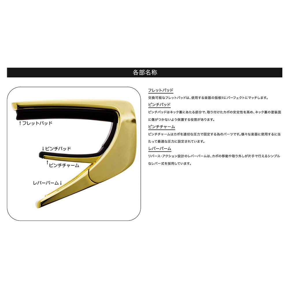 その他、握りこんで開く「リバース・アクション」機能が採用されており、1弦側からカポを取り付ける事で、演奏のポジションから手を返す事なくスムーズに指板上でカポを移動させる事を可能にします。