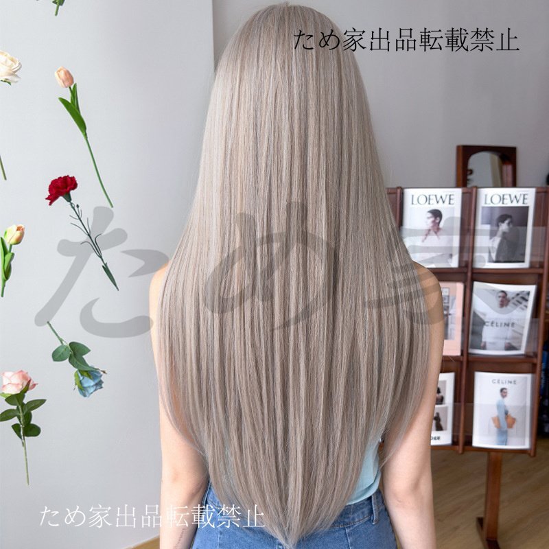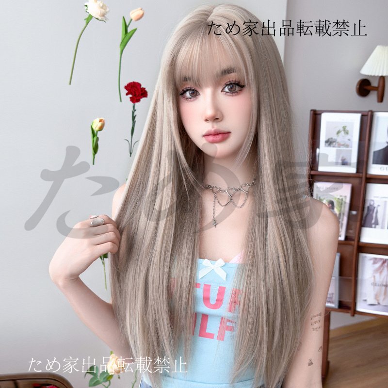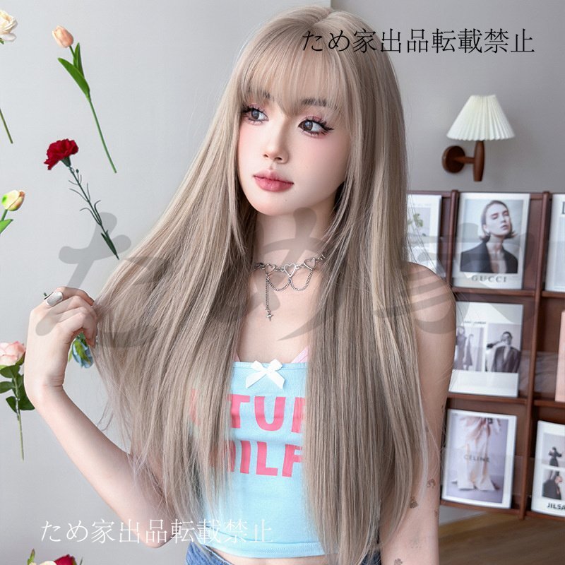 新品人毛 ロングストレートウィッグ フルバング ミルクティーグレージュ つむじ部分手植え 自然に見えますフルウィッグ