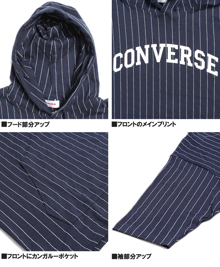 商品説明 | スニーカーでお馴染み、「CONVERSE/コンバース」のプリントデザインを利かせたストライプ柄の半袖プルオーバーパーカーです。 |