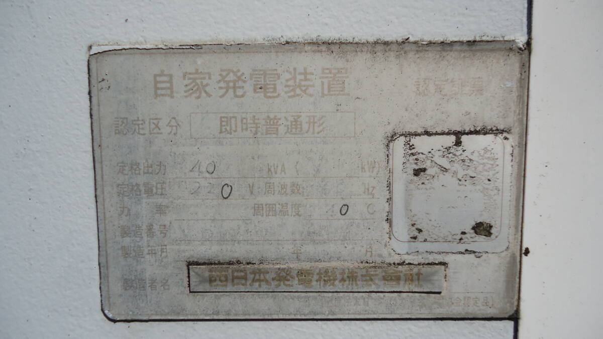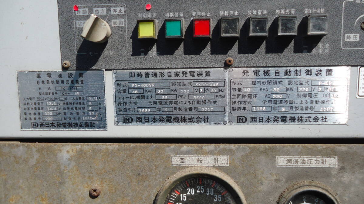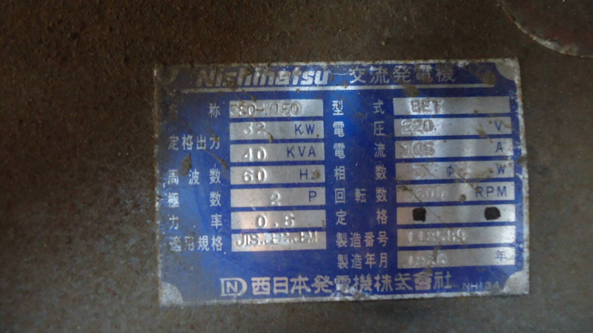 メーカーはニシハツ。 PX-400SR型。  エンジンはダイハツのDL型。ディーゼルエンジンです。燃料は軽油。   定格電圧は220Vの60HZ仕様。  出力は40KVA。 32KW相当です。