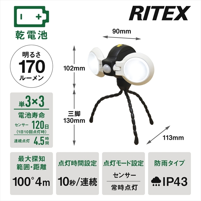・ 電源:アルカリ単三乾電池 3本(市販の単三充電池でも使用可能) ・ 電池寿命:センサーモード/約120日 常時点灯モード/約4.5時間 ・ 電球 ・電球種類:高照度白色LED、0.75W×2 全光束/約170ルーメン LED設計寿命(※1)/約40,000時間 ・ センサー機能:探知角度/水平約100° 探知距離(最大)/約4m ・ 点灯時間:常時点灯・切・センサー(約10秒点灯) |