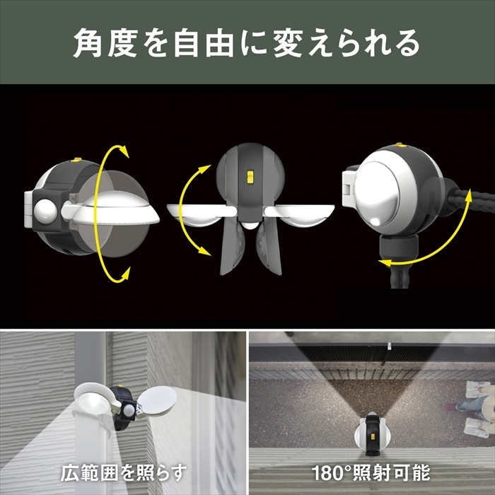 フリーアームでこれまでにない自由な配光。 どこでもセンサーライトダブルです。 ライトの方向自由自在。 防雨タイプ。 近づくとパッと点灯。 センサーで自動消灯。 どこでもアームで雨どい・柱に、スタンドで玄関に、手持ちで懐中電灯に。 照明・防犯・節電など、様々なシーンに対応します。 マグネット(付属)で物置にも設置いただけます。 脱着式三脚付き。 |