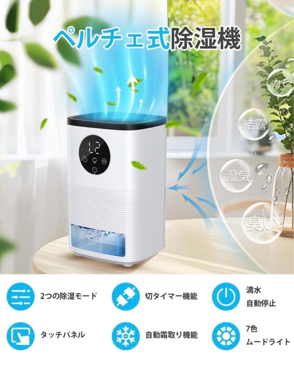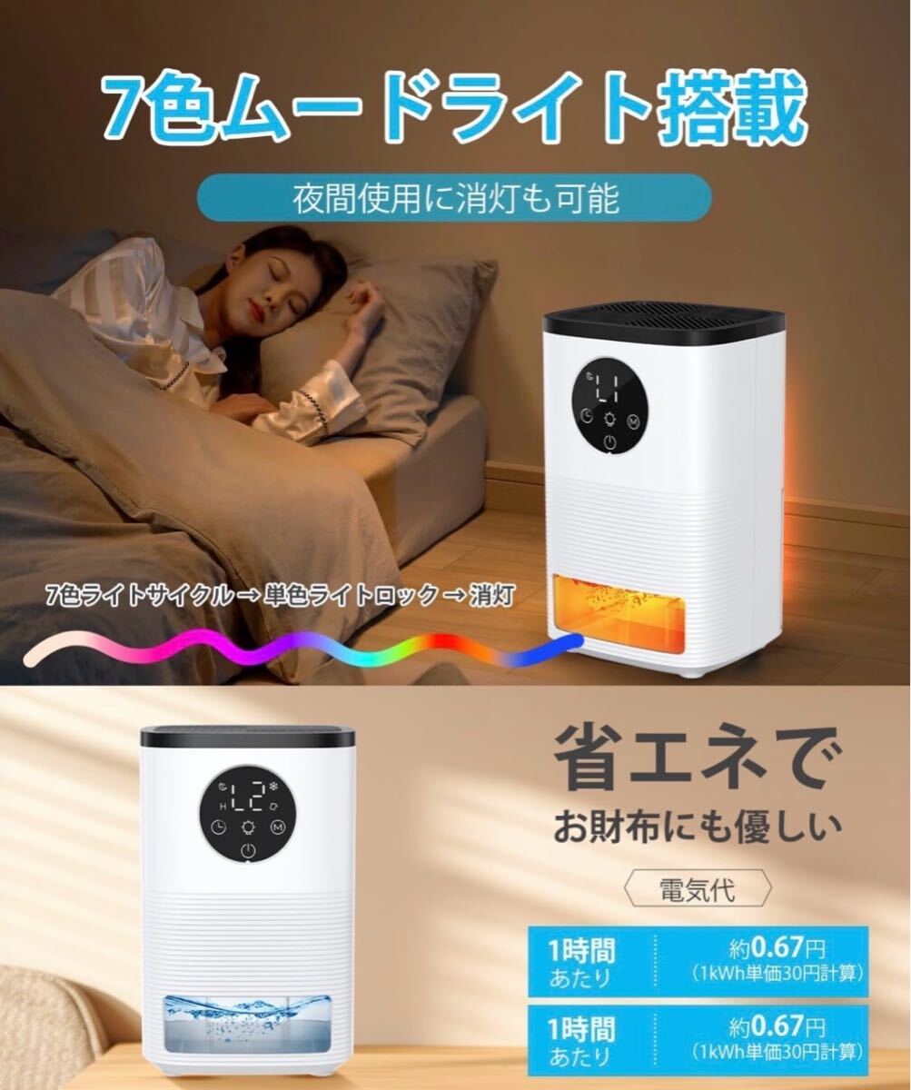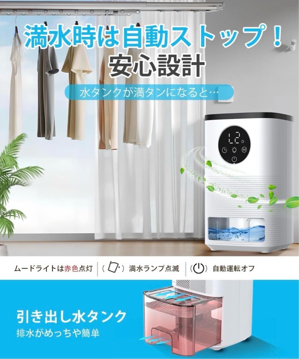 智能制御機能が充実。タンク満水時には自動停止し、ブザー音と赤ランプ(ムードランプが赤く点灯)で警報し、溢水による家具の損傷を防ぎます。低温時には自動霜取り機能が作動、霜の蓄積を防ぎ、機器を保護。タイマー機能も搭載し、4H、6H、12H、24H、連続運転の設定が可能。