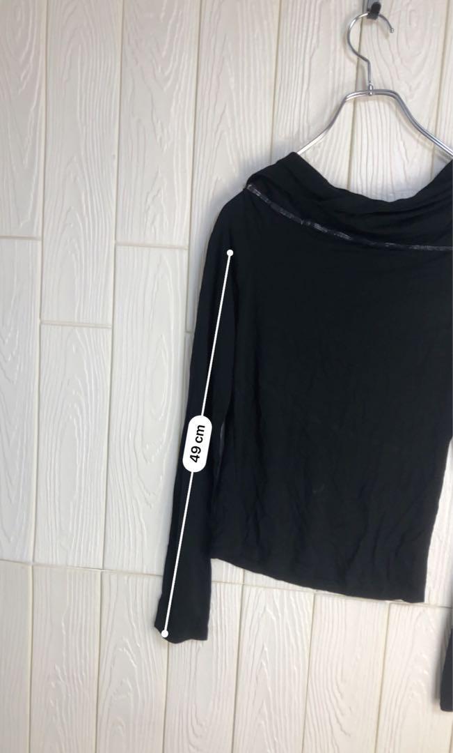 ドレープネックデザインのフィット感のある黒の長袖トップス。