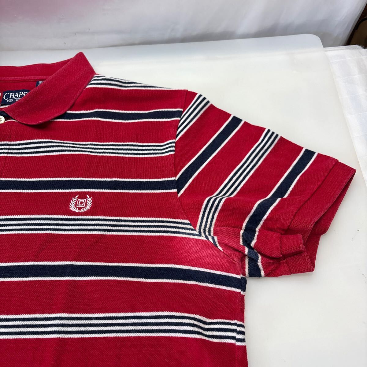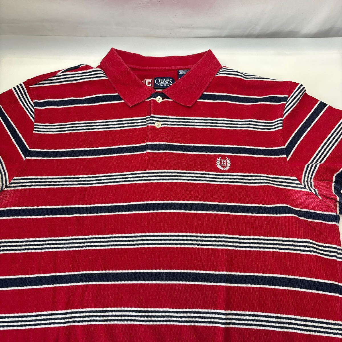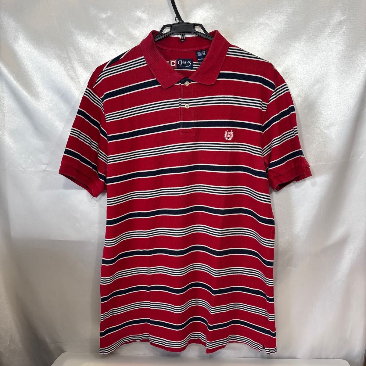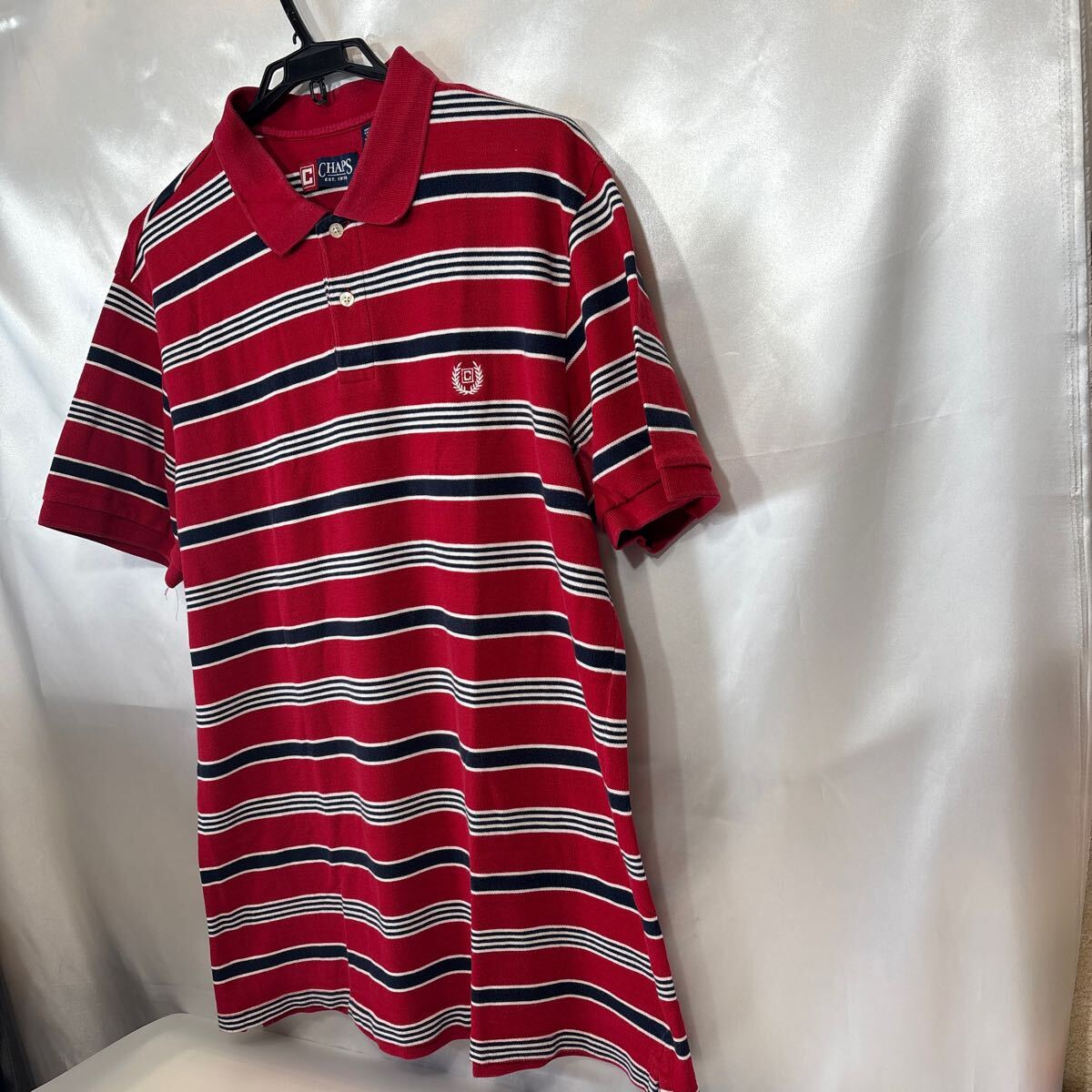 135♪USユーズド★チャップス Chapsポロシャツ 半袖ブランドメンズ刺繍ロゴ コットンレッドストライプUS-XLサイズ(使用感2XLサイズ)