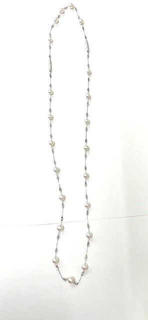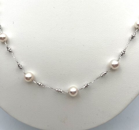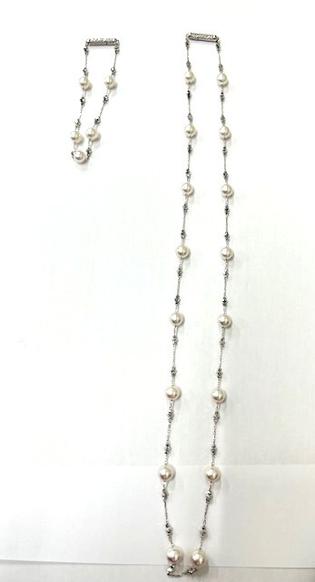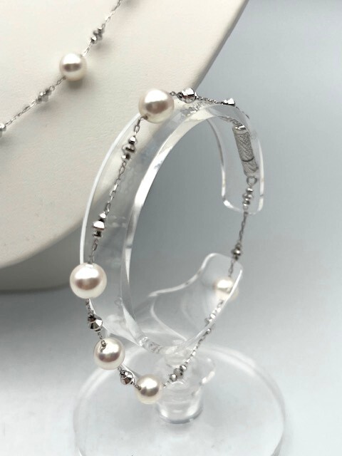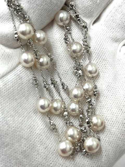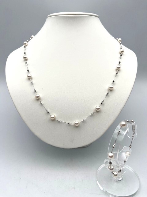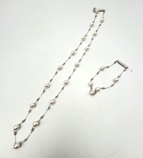 K18WG×パール ネックレス&ブレスレット 計2点セット K18WG×パールのネックレス&ブレスレット、計2点セットでございます。 金具部分がマグネットになっています。ネックレスとブレスレットを繋げるとロングネックレスにもなります。 素敵なセットのお品でございます。是非この機会にいかがでしょうか 重量:ネックレス約8.6g ブレスレット約3.0g 2点共:止め具にK18WGの刻印あり 状態;未使用保管品になります。綺麗です。購入時の値段タグ付き 付属品:箱 |