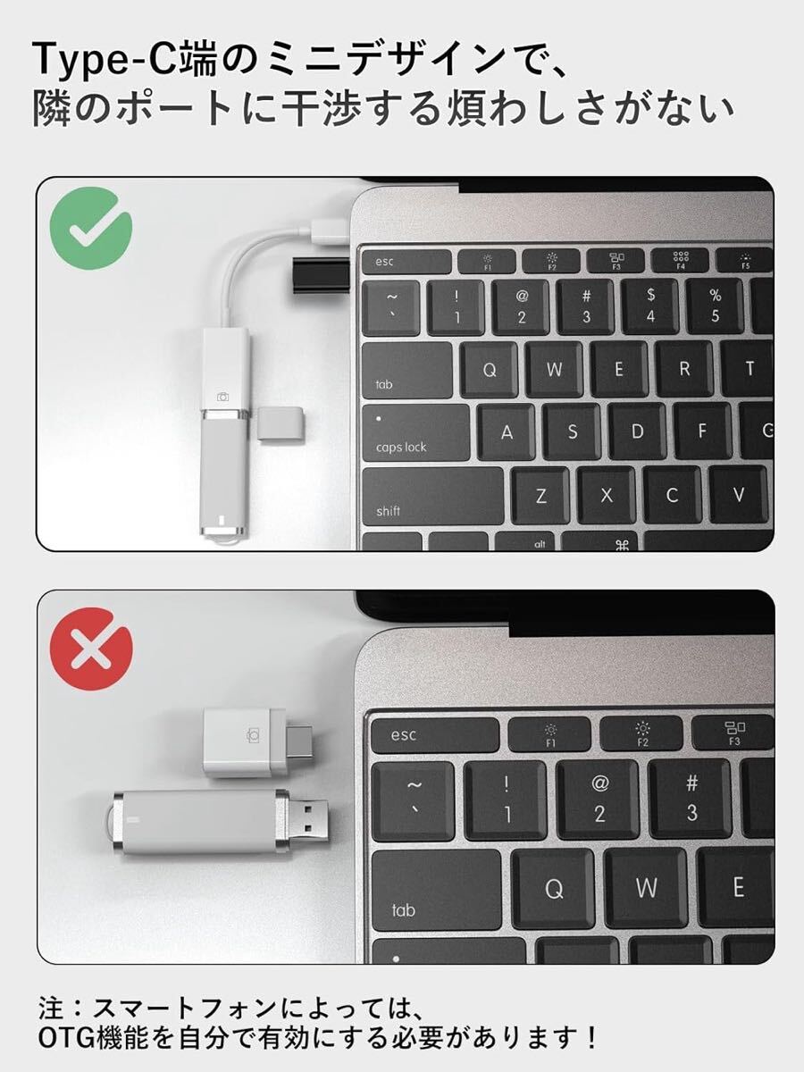 【OTG機能】本製品usb type-c 変換アダプタはOTG機能を搭載しており、キーボード、マウス、ハードディスク、ゲームコントローラー、USBメモリー、カードリーダーなどのUSB機器を外部接続したり、Type-cポートに対応したスマートフォンやタブレットなどに接続することができます。設定不要でプラグアンドプレイです。