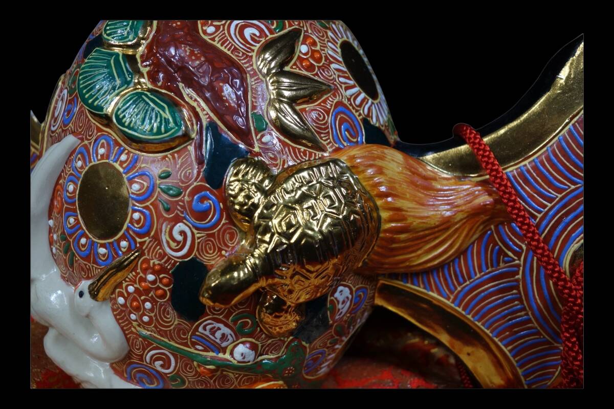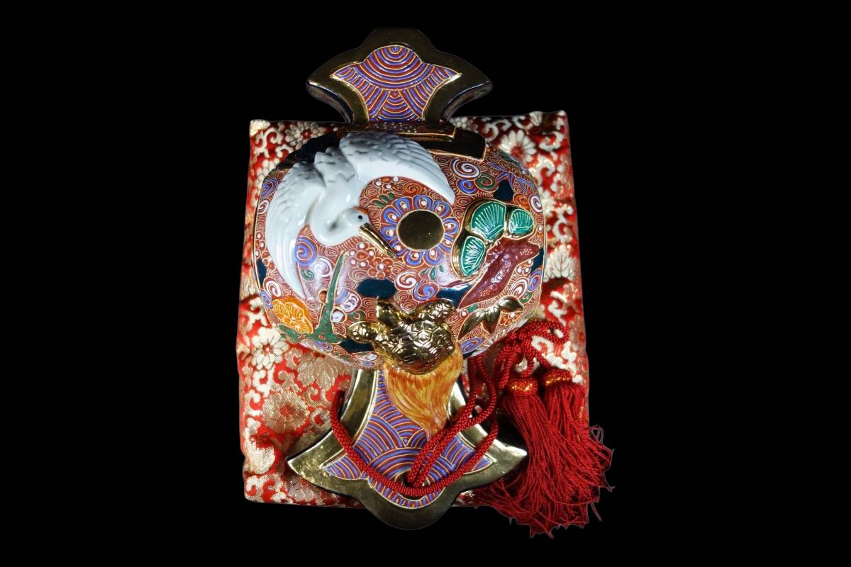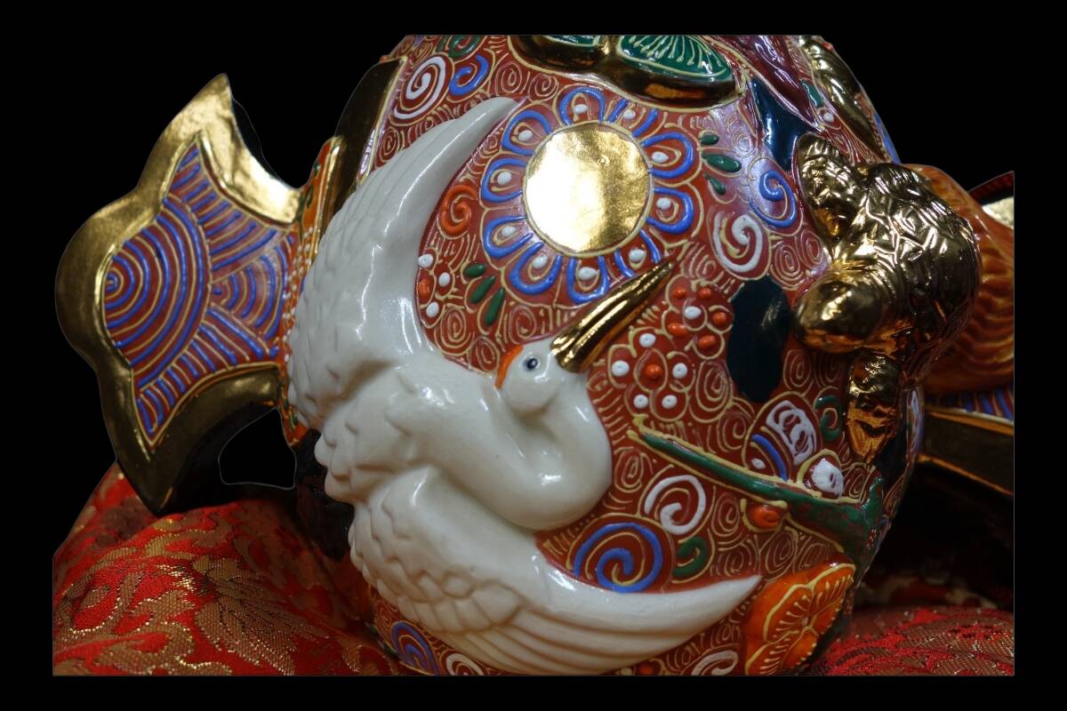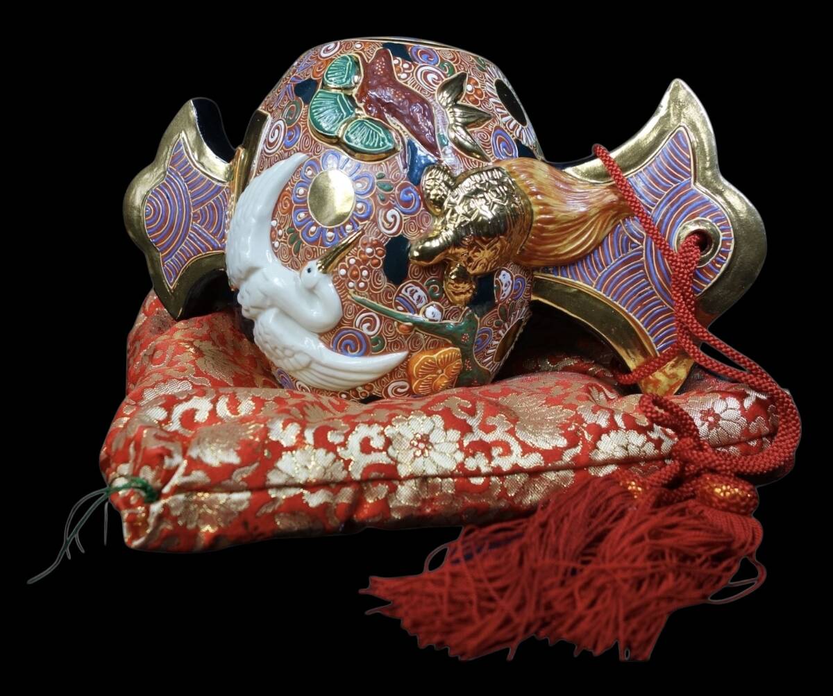 「福を呼ぶ」縁起物の象徴! 九谷焼 鶴亀盛宝小槌 打ち出の小槌 座布団付 置物 1990〜2000年代 KNS705