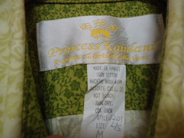 ハワイにて、USED物として、購入しました。長袖です。。Princess Kaiulani社製。オールオーバー。シェルボタン。コットン100%素材です。カラーは、薄緑色地に、花柄です。ハワイ製。クリーニング済みです。なお、当商品のサイズ表示は、全てUSAサイズです。サイズ表示は、Mですが、平置き実寸を重視して下さい。なお、少々誤差は、ご了承下さい。肩幅約46センチ・身幅(脇の下)約51センチ・丈約75センチ・袖丈約62センチです。少々所々汚れ(6・7・8枚目画像)あります。ヴィンテージ物なので、古着に、ご理解のある方・24時間以内に、お手続き入力後、期限内にかんたん決済、出来る方のみ、ご入札をお願い致します。この商品は、1点物です。 ※※発送方法・送料は、レターパックライト郵便(追跡可能・補償無し)ですと、430円又は、レターパックプラス郵便(追跡可能・手渡し配達・補償無し)ですと、600円又は、ゆうパック送料着払い便(持ち込み割引有り・追跡可能・手渡し配達・補償有り・かんたん決済時は、送料0円ですが、送料のみ到着時支払い)です。※※ ☆★★★★★☆送料は、変わりますが、何点でも、同梱包可能です。数点落札されましたら、まとめて取引を、選択お願いします。☆★★★★★☆