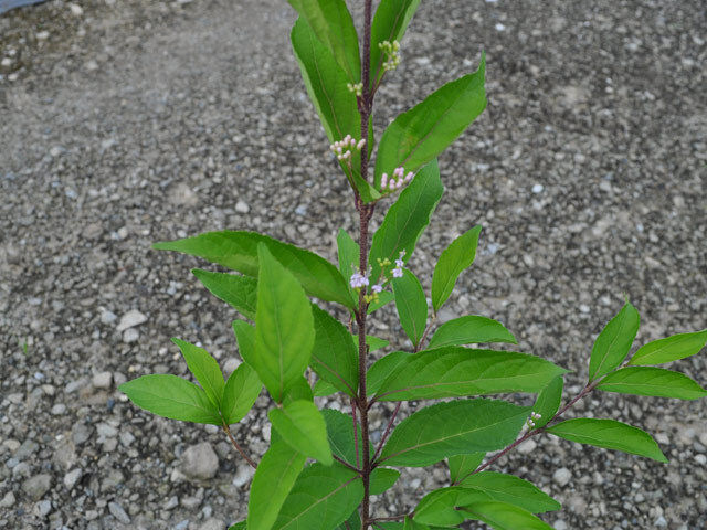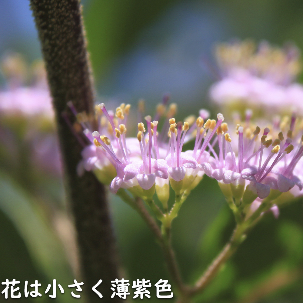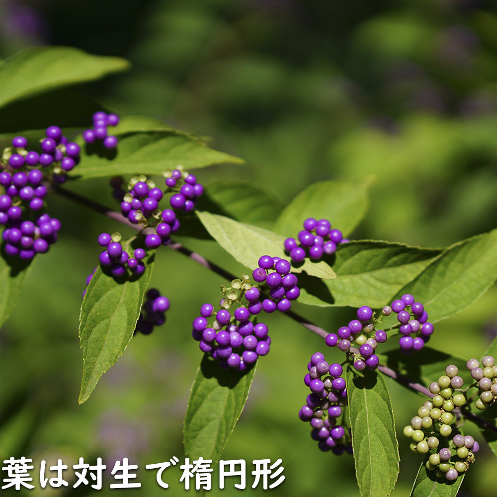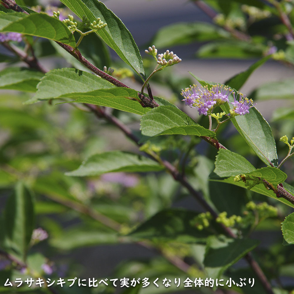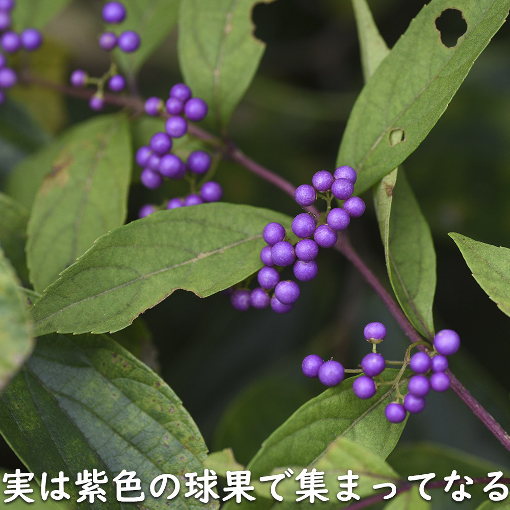 コムラサキは原種よりも実や花付きがよい品種です。低木で見栄えがするので人気があります。和風にも洋風にもあう品種です。