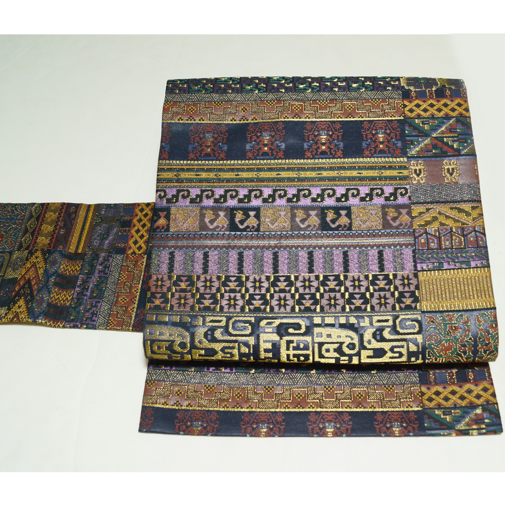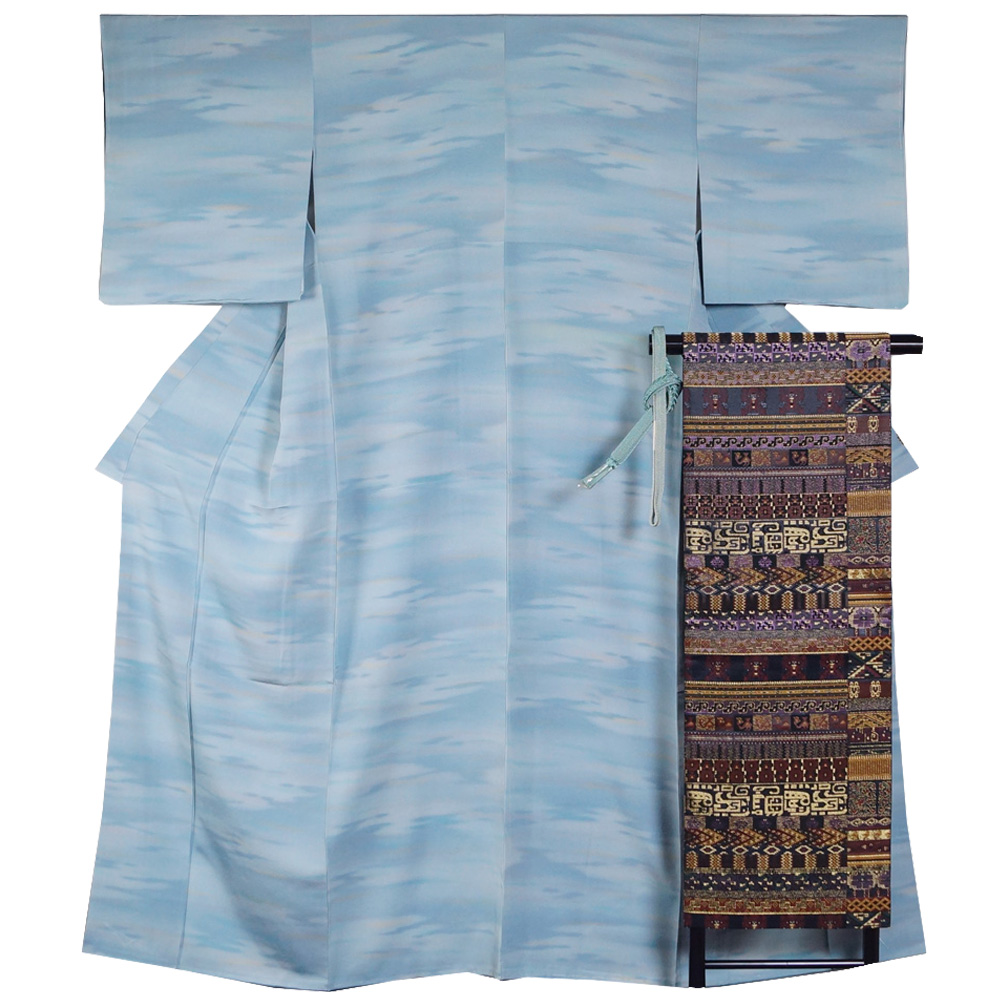 | 商品 説明 | 水色系ぼかしのちりめん地に、虹色ぼかしの霞模様が染められた小紋と、黒色系の地に横段に幾何学的な古代文明模様が織られた名古屋帯、水色系ぼかしの平組の帯締めの3点セットです。  |