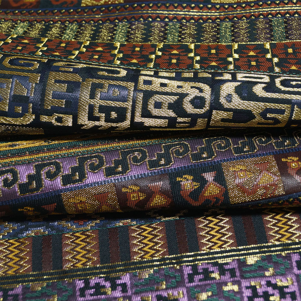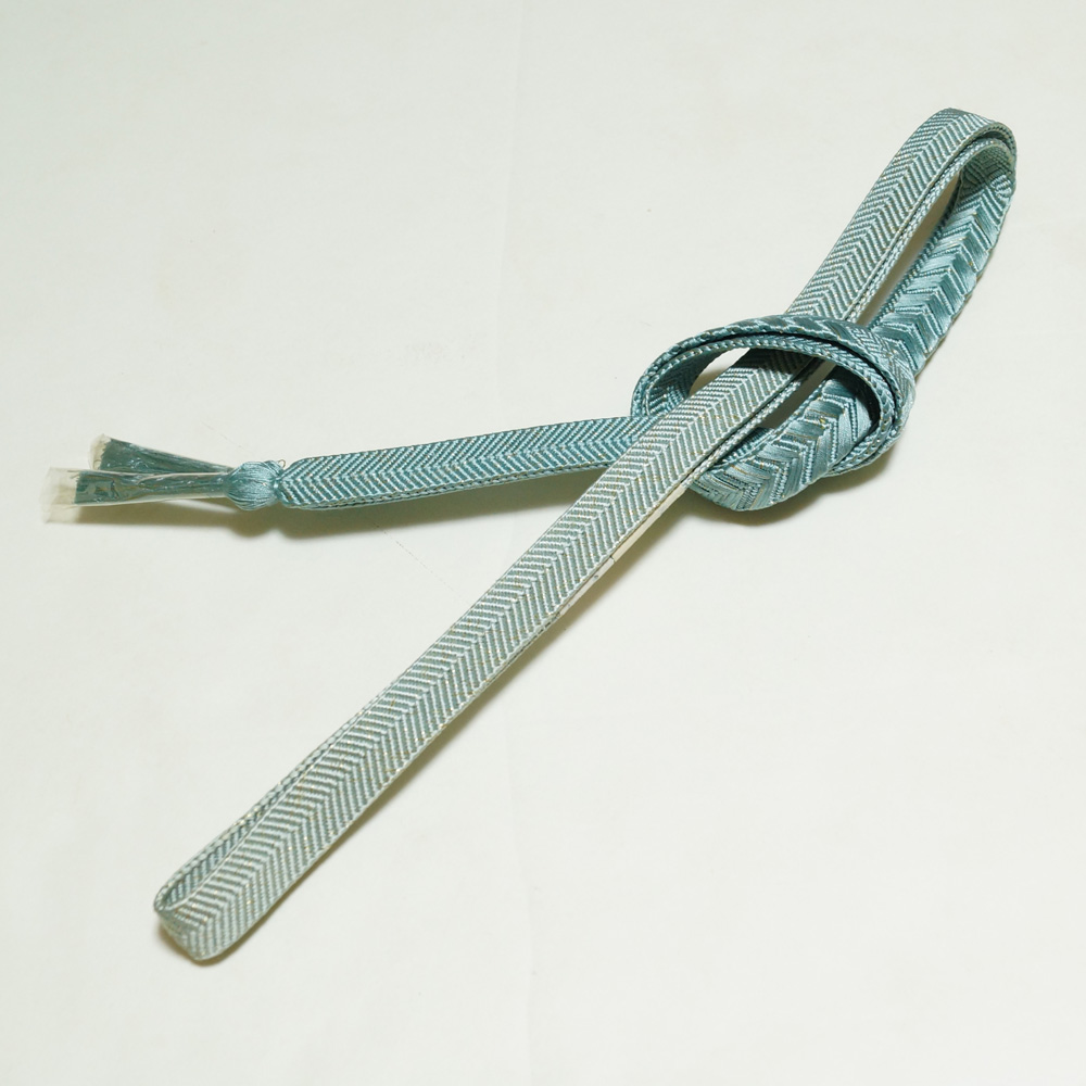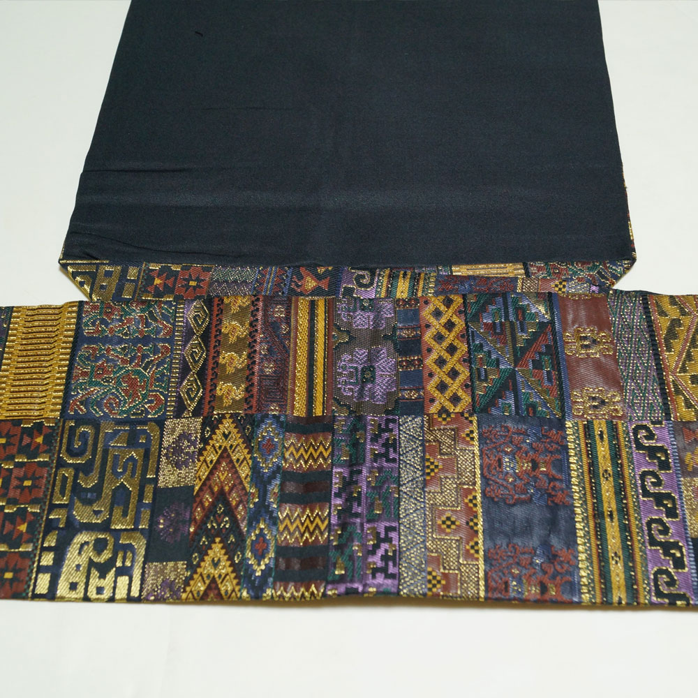 商品 説明 | 水色系ぼかしのちりめん地に、虹色ぼかしの霞模様が染められた小紋と、黒色系の地に横段に幾何学的な古代文明模様が織られた名古屋帯、水色系ぼかしの平組の帯締めの3点セットです。 |