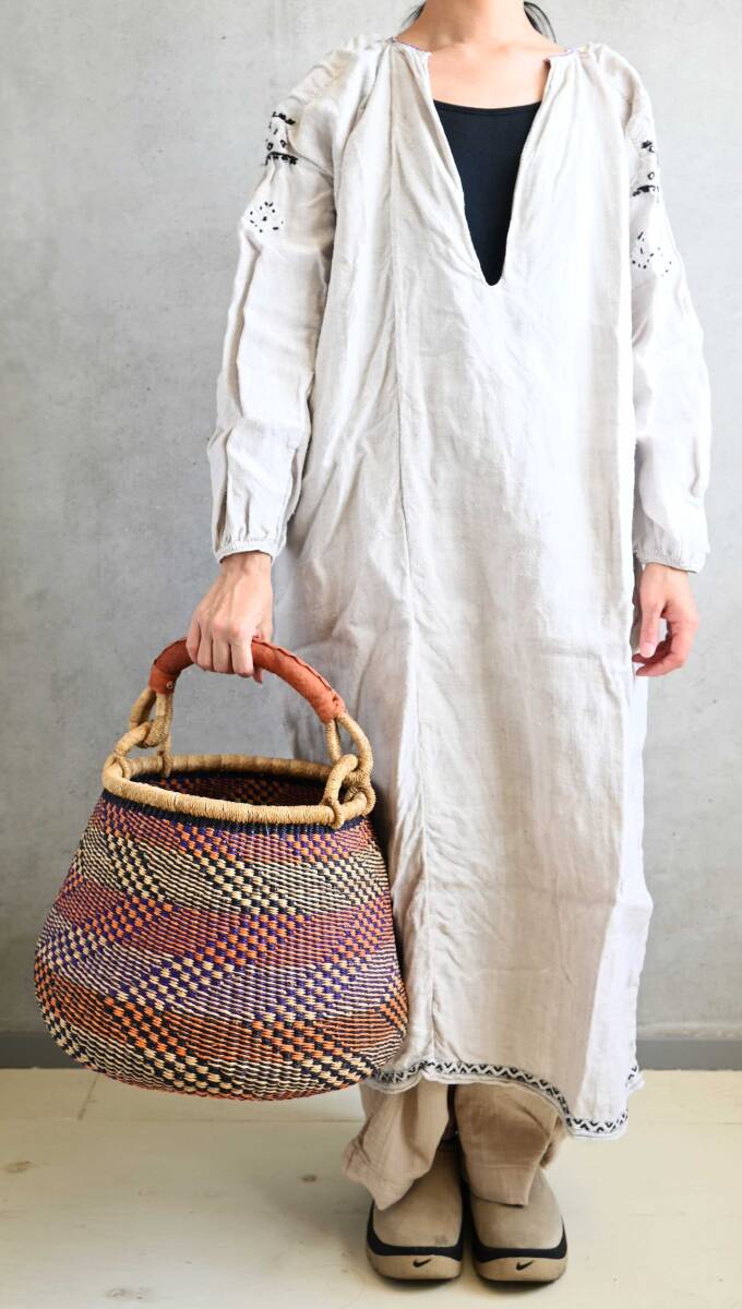 エレファントグラスと呼ばれる水草を用い、ボルガタンガでバスケットが編まれ、その後ブルキナファソの革職人に送られ山羊革のハンドルを着けられます。「ボルガバスケット」「ブルキナバスケット」のふたつの呼ばれ方があるのはそのためです。