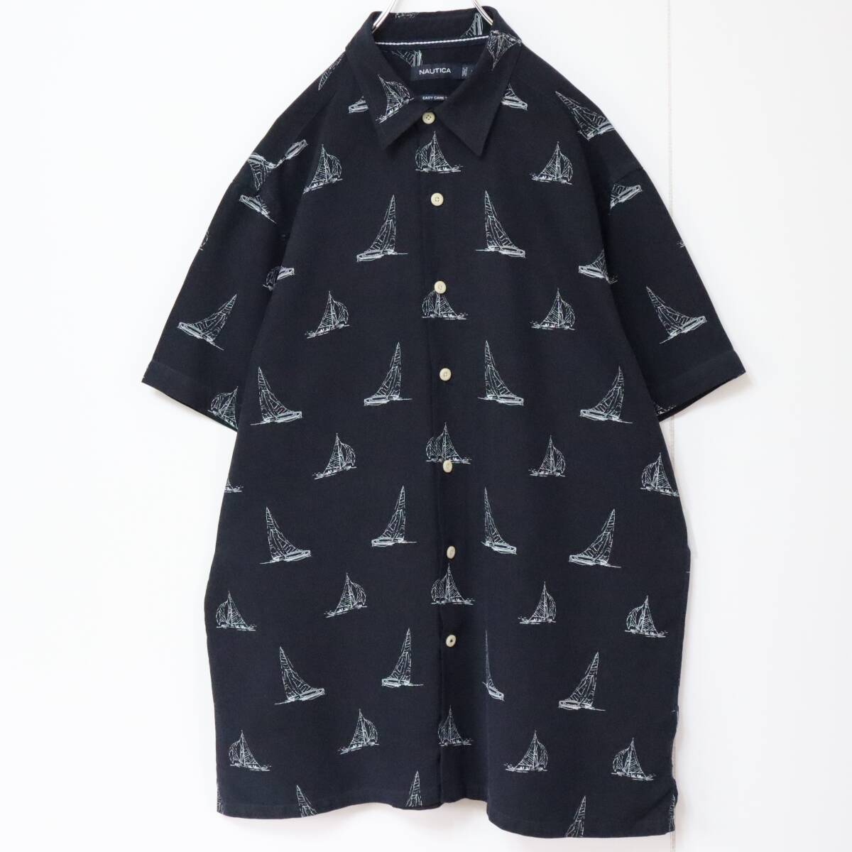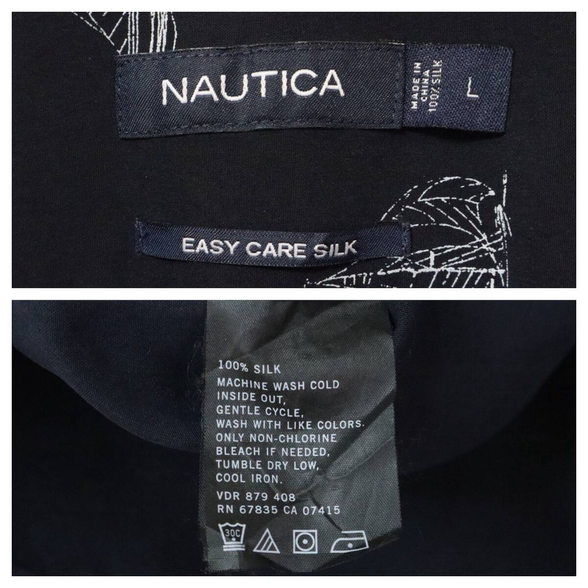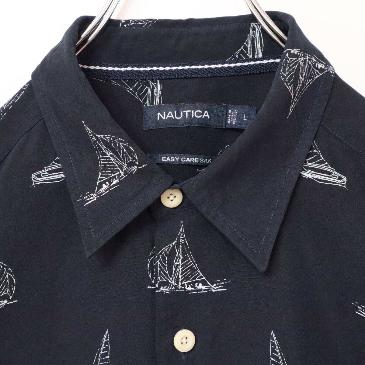 【シルク100%】ノーティカ 総柄シャツ ヨット セーリング柄 Lサイズ 紺色