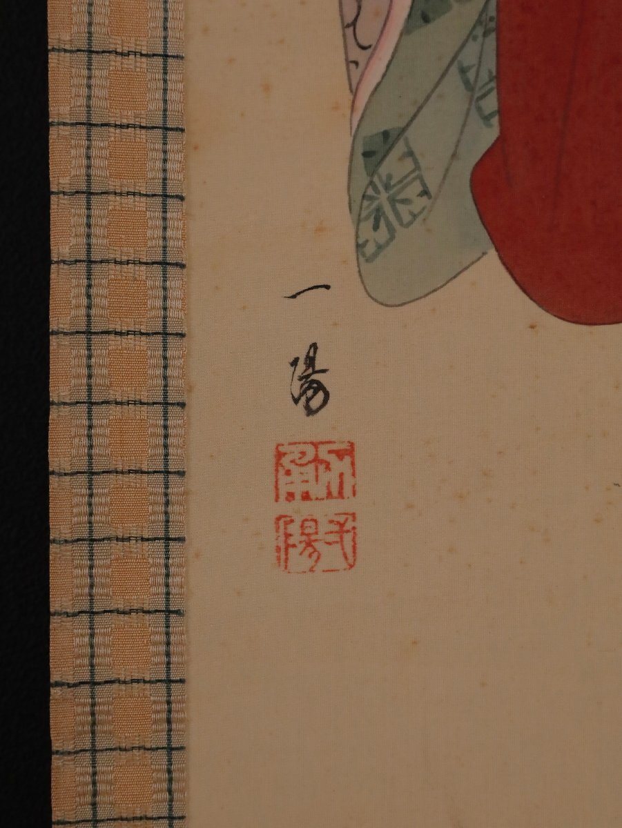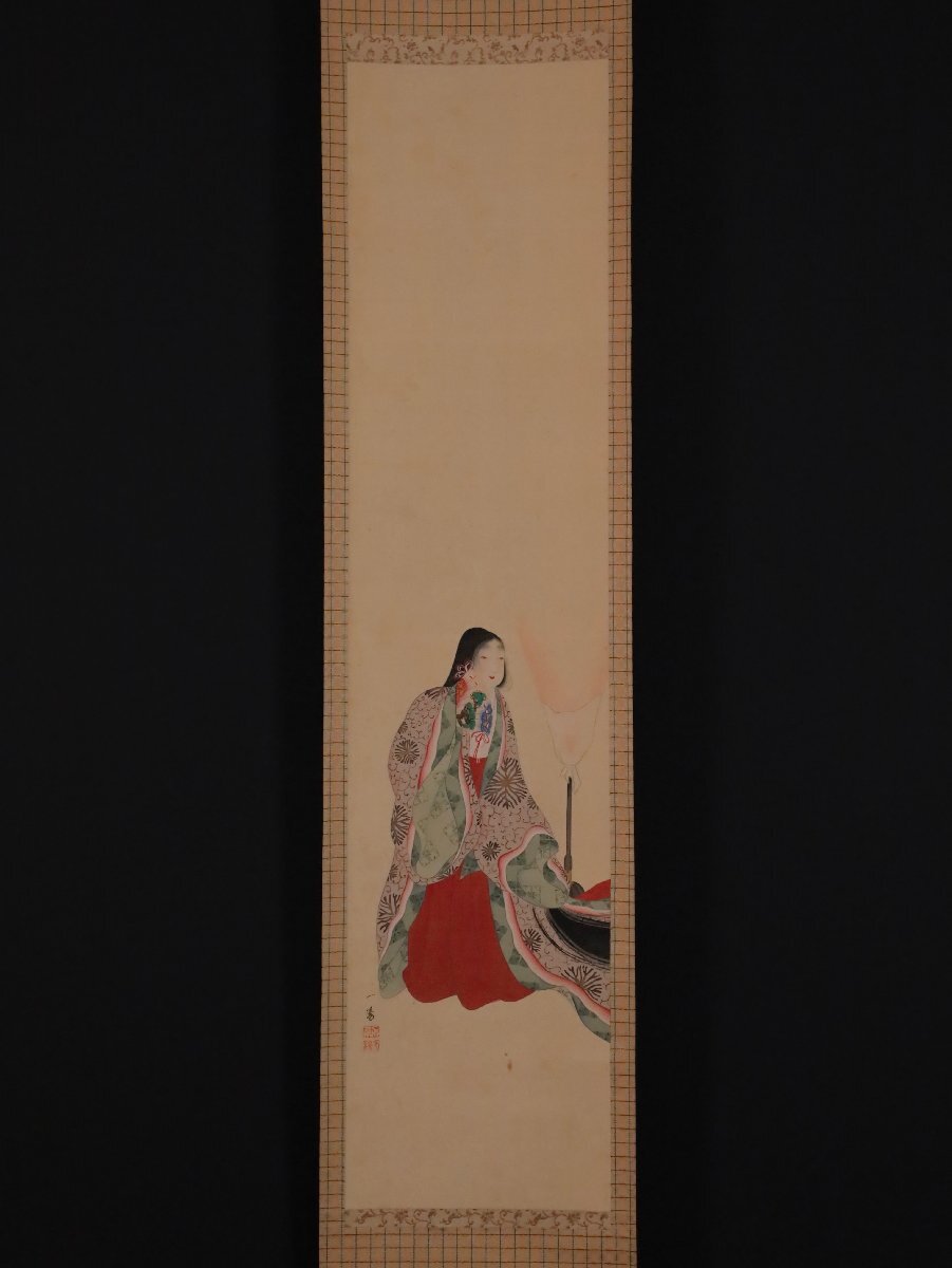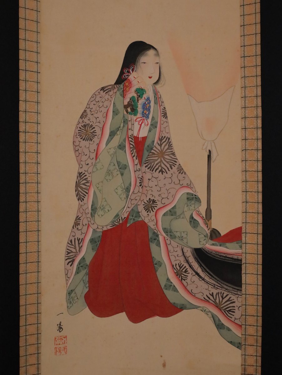 【模写】吉】12454 奥谷一陽 徒然 美人図 共箱 奥谷秋石の嗣子 茶掛け 茶道具 大和絵 風俗画 物語絵 平安人物 掛軸 掛け軸 骨董品
