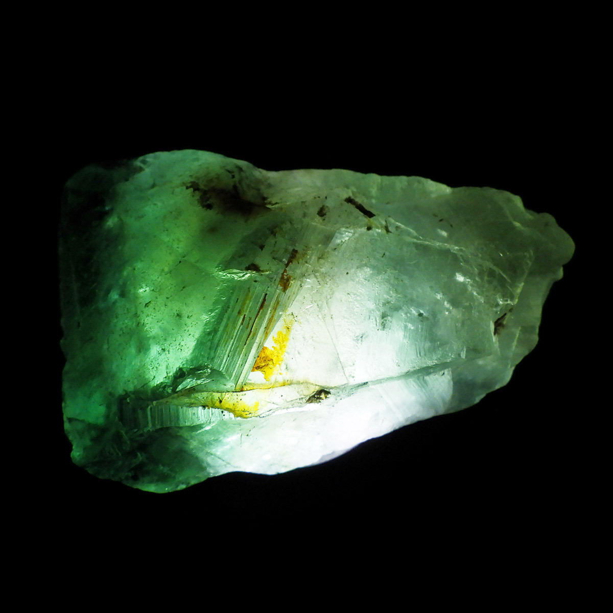 マダガスカル産グリーンフローライトの原石です。深みのある神秘的なグリーンが魅力的。ブラックライトを当てると、淡く幻想的に光る蛍光性を持っており、コレクションにもぴったり。深いグリーンの色彩を持っているので磨いてみるのも面白いかもしれません。掌に収まるお手頃サイズで、デスクや棚にも気軽に飾っていただけます。