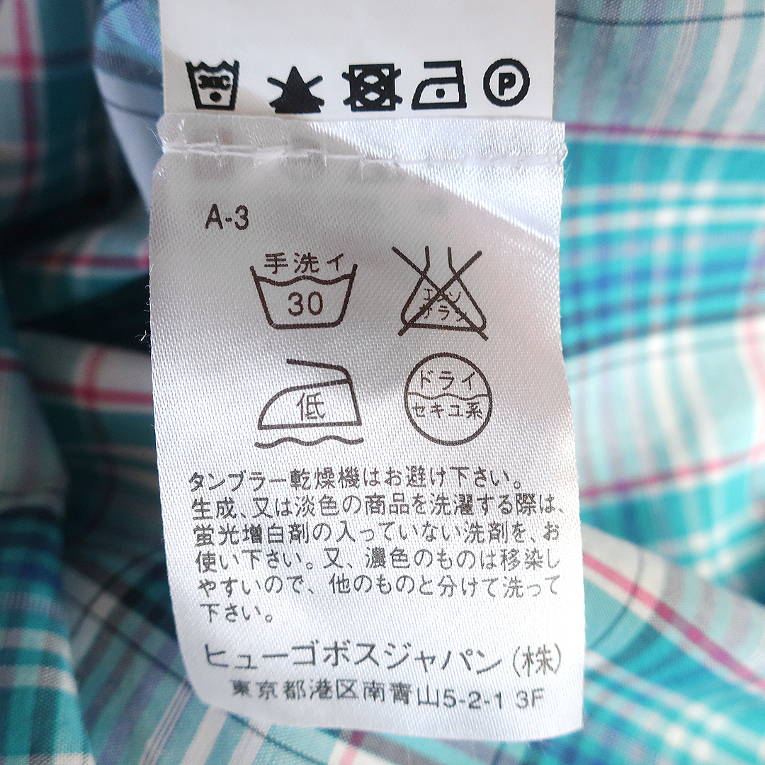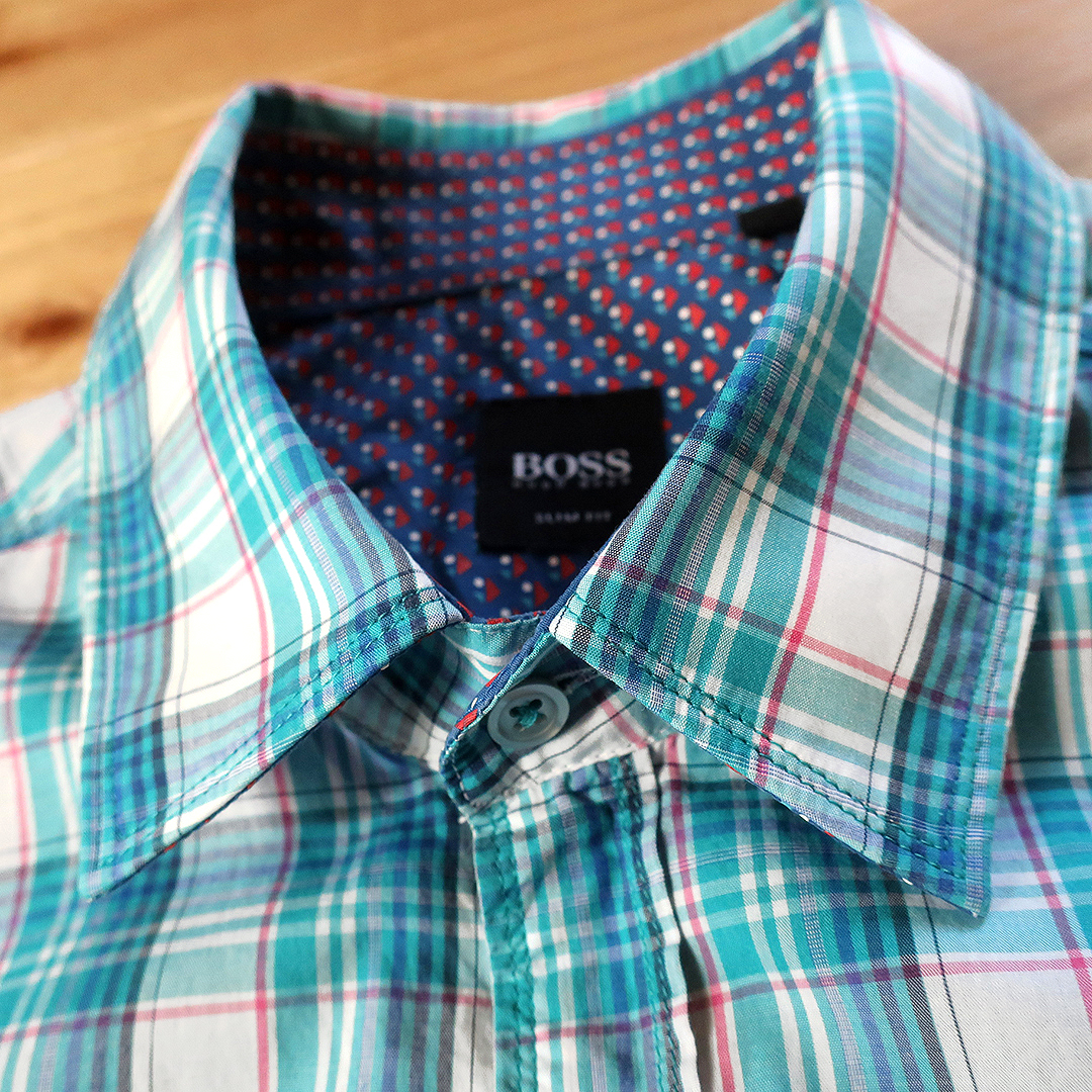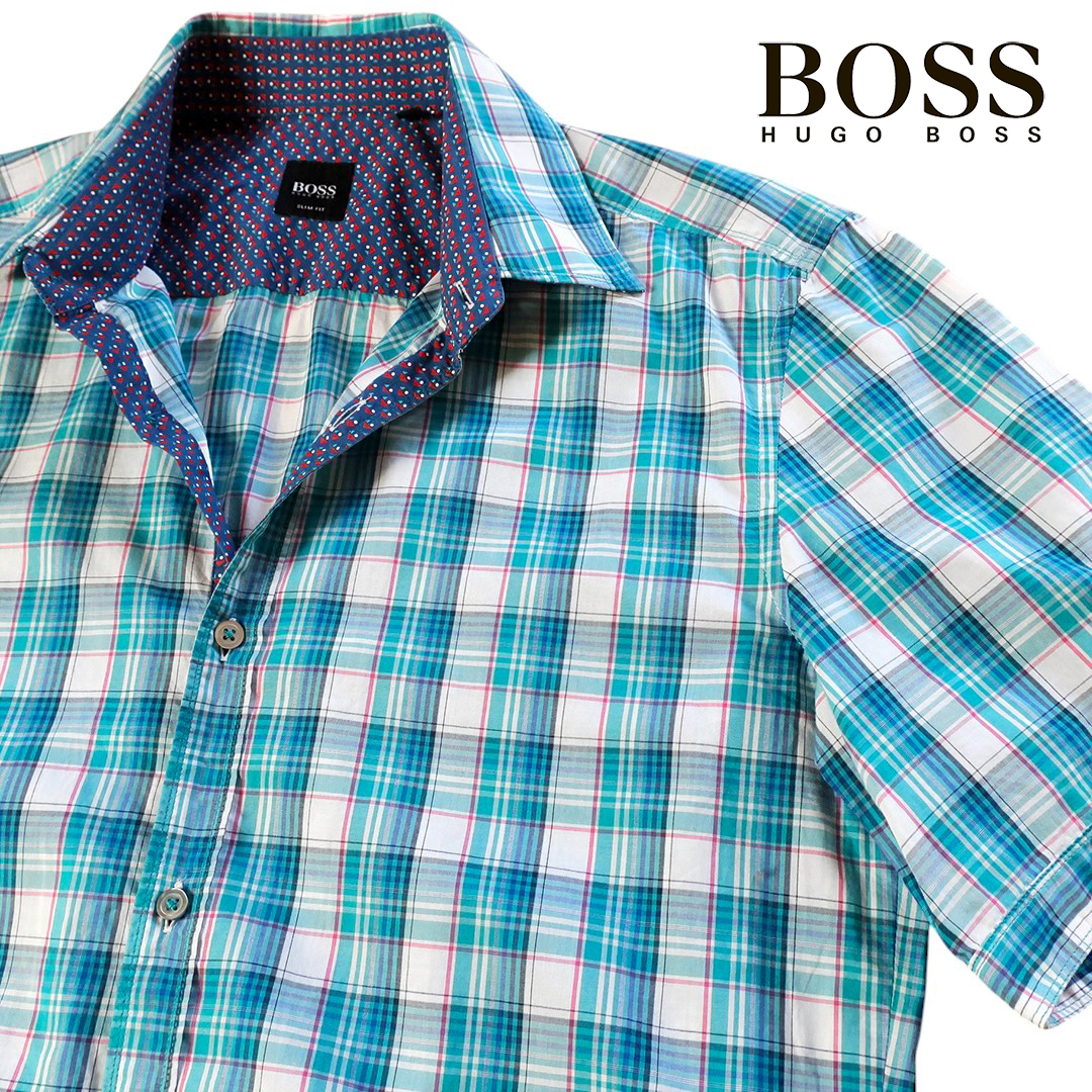 美品 HUGO BOSS ヒューゴボス クラシックチェックシャツ 半袖 トリコブルー (S) SLIM FIT