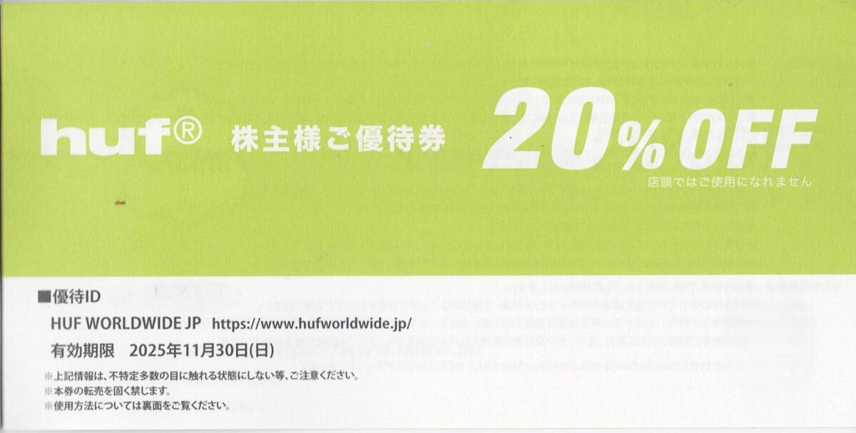 出品数4【コード通知】HUF WORLDWIDE JP 20%オフ割引券1枚 TSI 株主ご優待券★2025.11.30★株主優待 | |