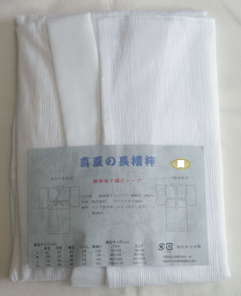 従来の胴抜き襦袢や長襦袢では身頃だけ綿で袖がポリエステルを使用している場合が多いのですが、こちらの商品は袖にも綿麻格子織クレープを使用。