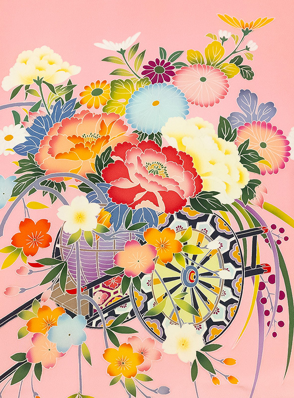 | ※記念感謝祭☆正絹特撰京友禅伝統工芸加賀五彩染祝い花車古典文に四季花の豪華多色三段ボカシ友禅染☆お祝着 |
