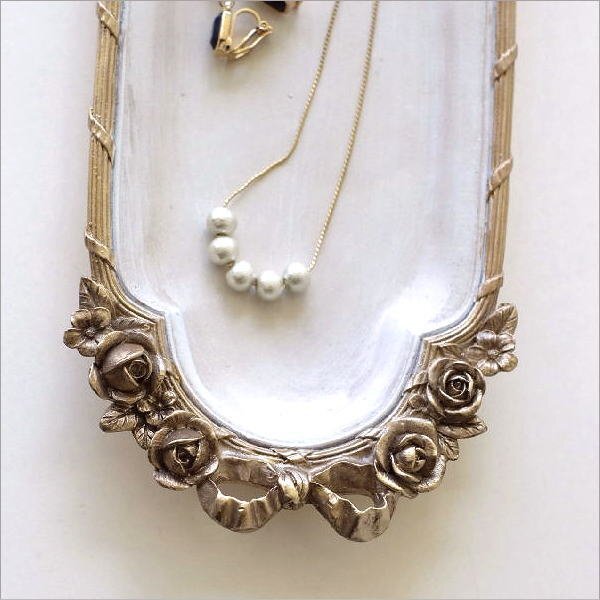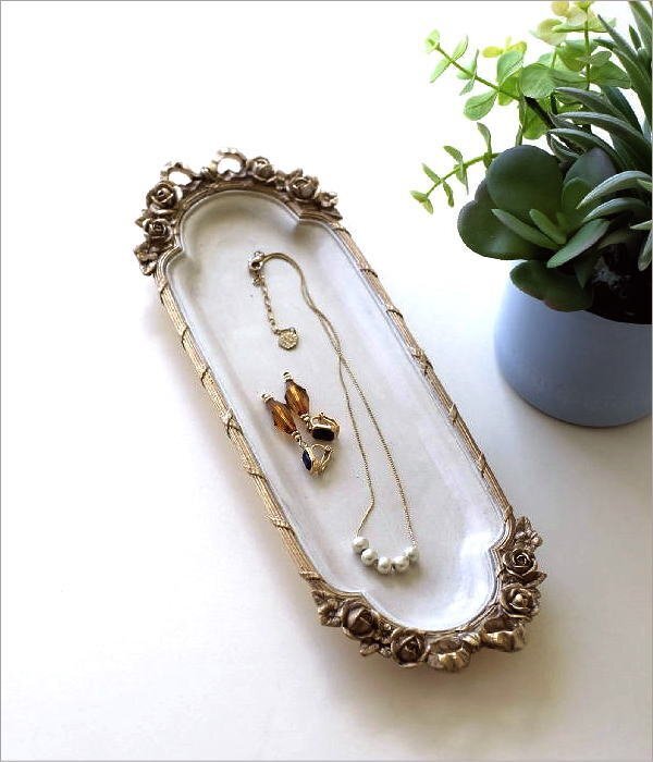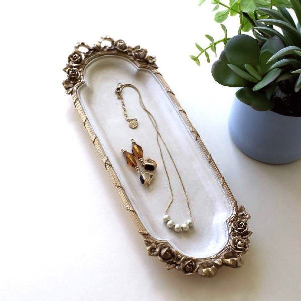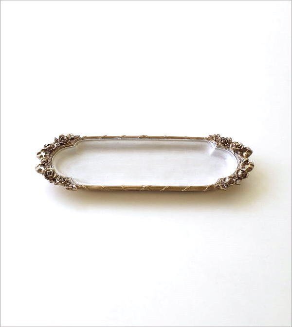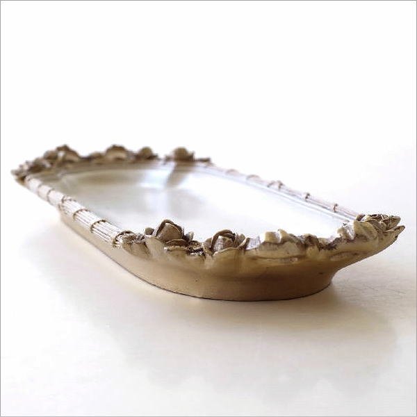 | 薔薇とリボンのレリーフをあしらった クラシカルでロマンチックなデザインの アンティーク調のトレイ ネックレスの絡まりを防げそうな ロングなトレイで アクセサリーはもちろん、 ペントレイとしてや眼鏡置き、 香水瓶を並べても 素敵な空間が生まれそう ドレッサーやデスク、玄関が華やぐ ラグジュアリーなトレイです 商品名 : ローズリボンのベルサイユトレイ S 商品番号 : vin5470 全体サイズ(cm) : 幅27×奥行9×高さ2.5 材質 : ポリレジン 重量 : 290g 生産国 : 中国 ※商品の特性上、わずかなガタつきはご容赦ください ※全体にエイジング加工を施したアンティーク調デザインです ※ディスプレイによる色の違いはご了承下さい |