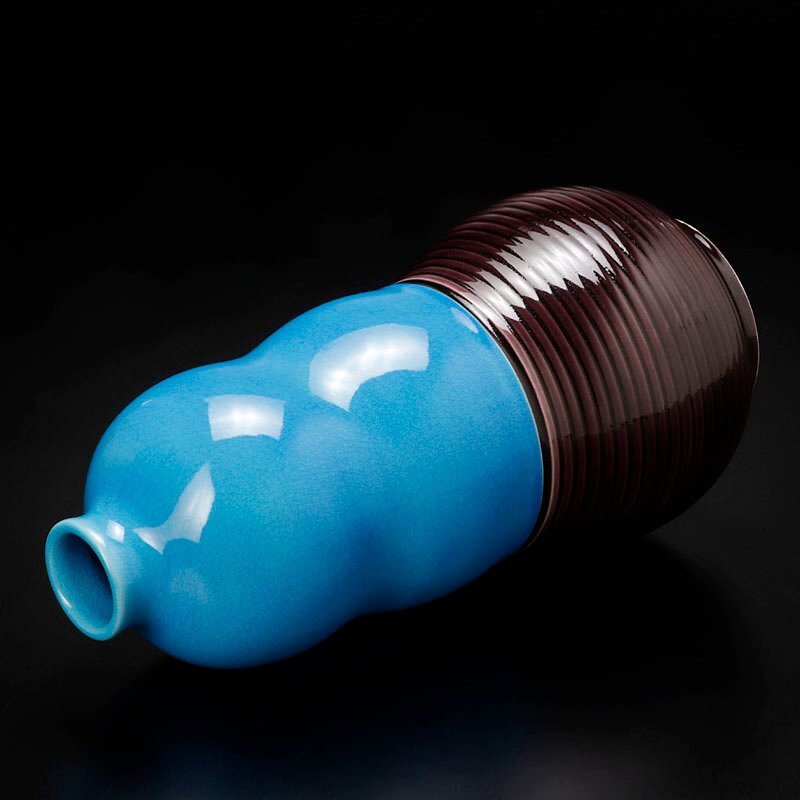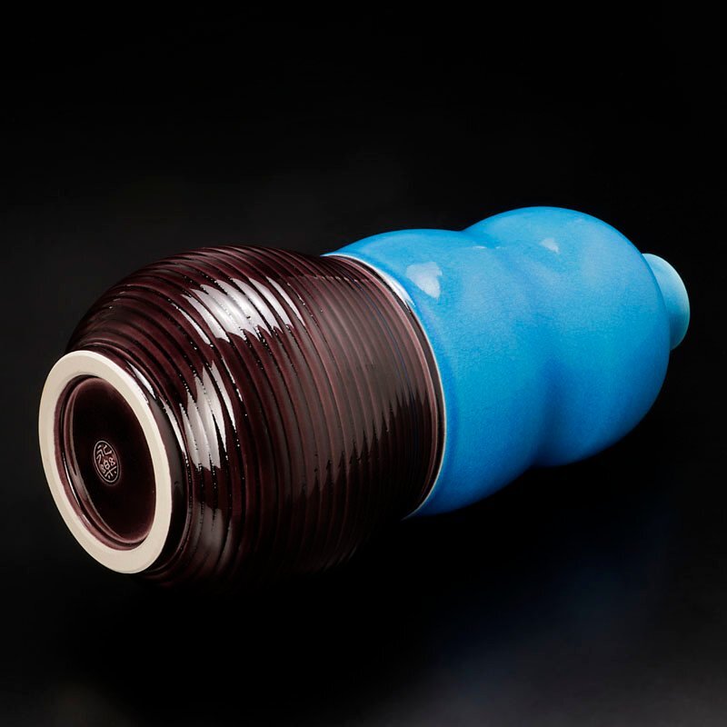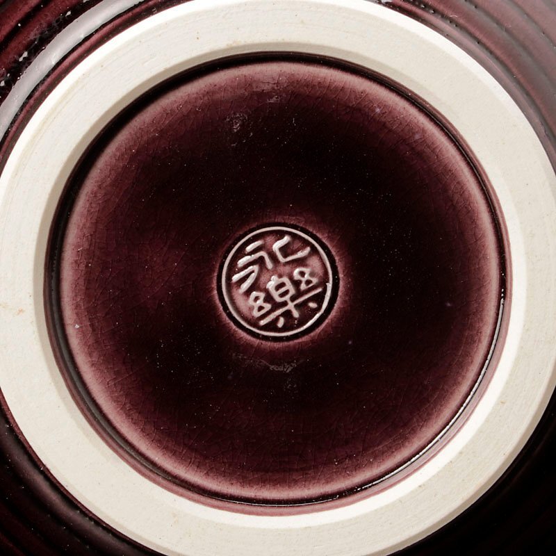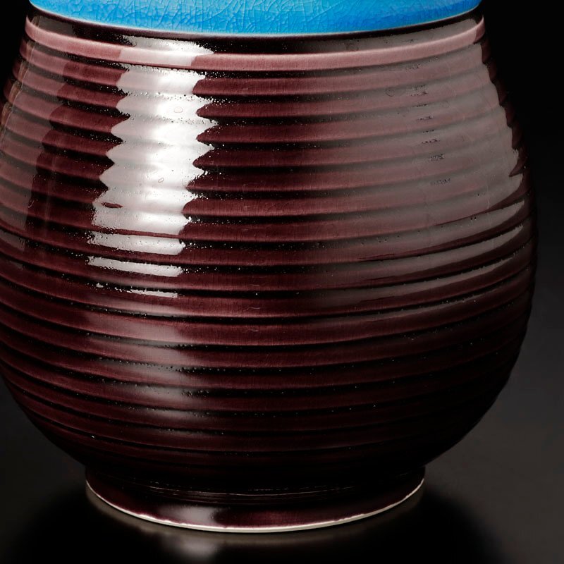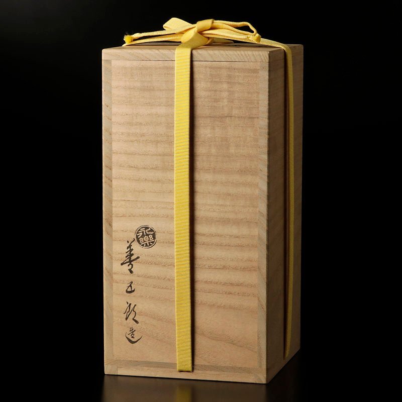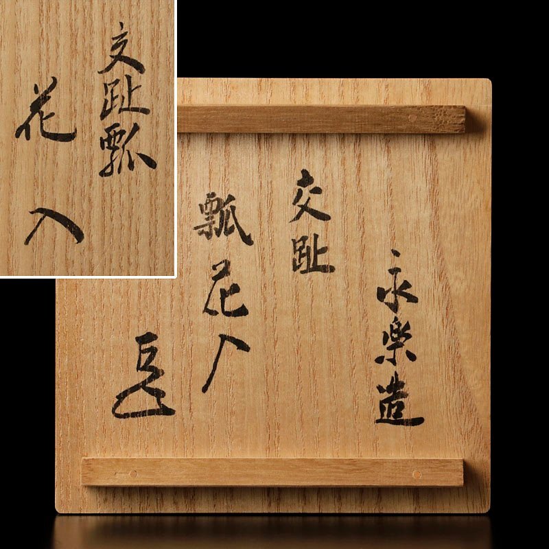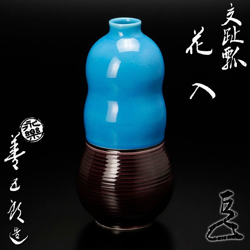 | 交趾の鮮やかな青と紫の色彩に柔らかい瓢形の曲線が魅力的な花入です。 ★商品は十七代永楽善五郎造、而妙斎書付の作品である事を保証致します。 |