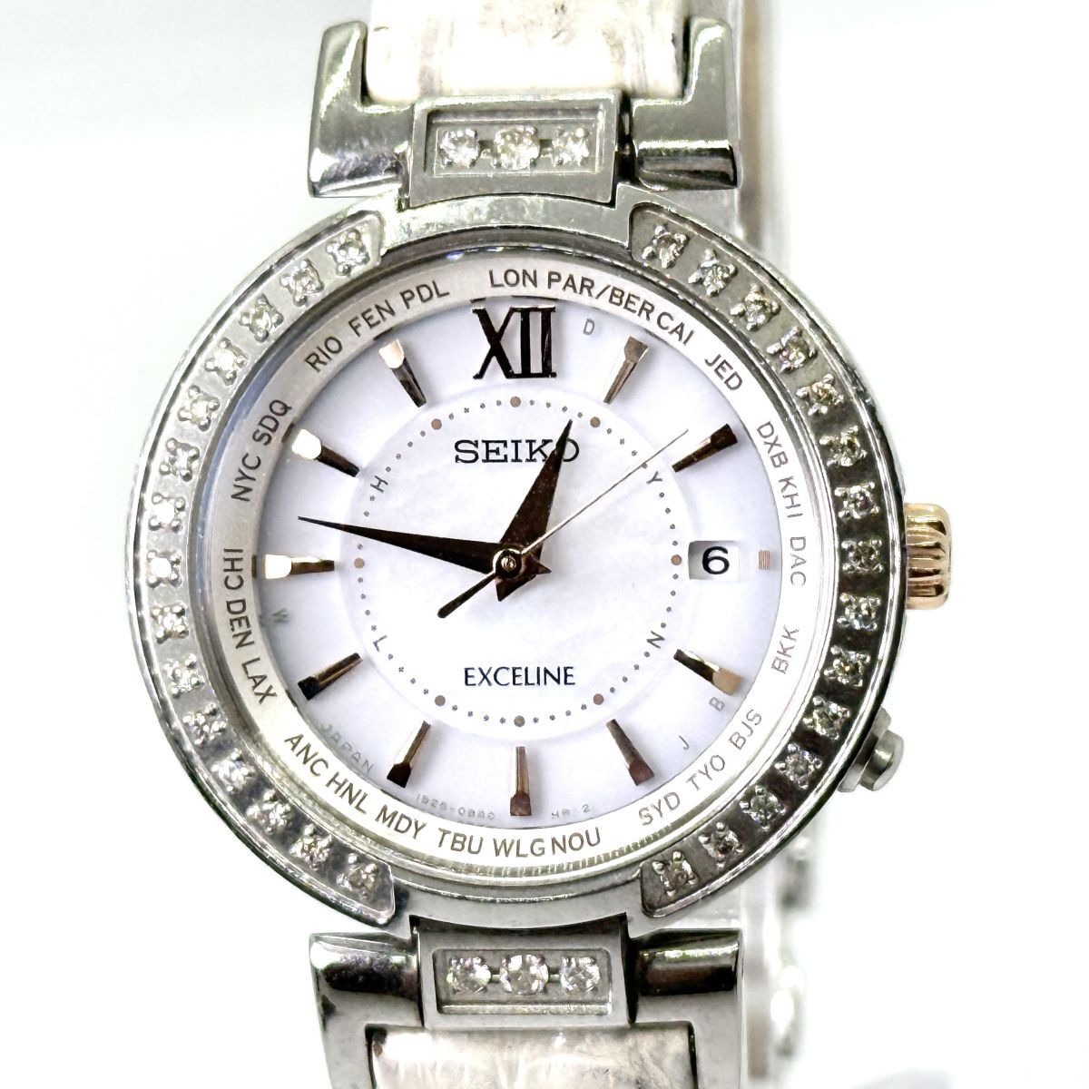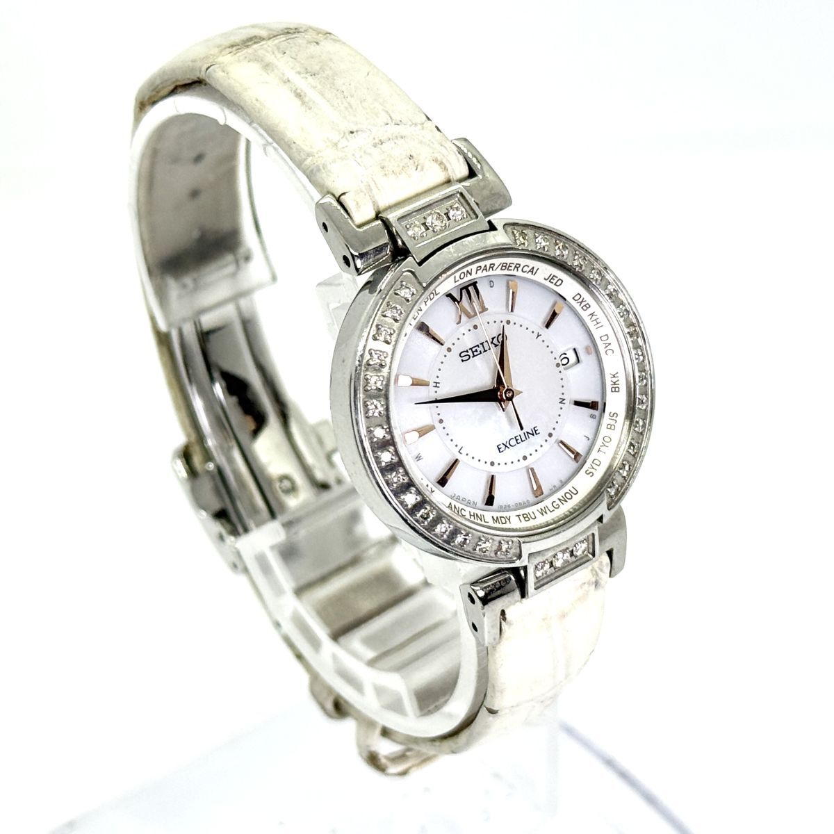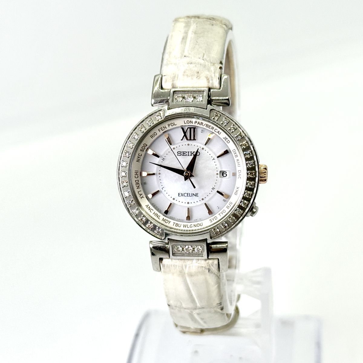 T5175 SEIKO セイコー EXCELINE エクセリーヌ 1B25-0AS0 680331 ダイヤベゼル 革 電波ソーラー シェル文字盤 レディース腕時計