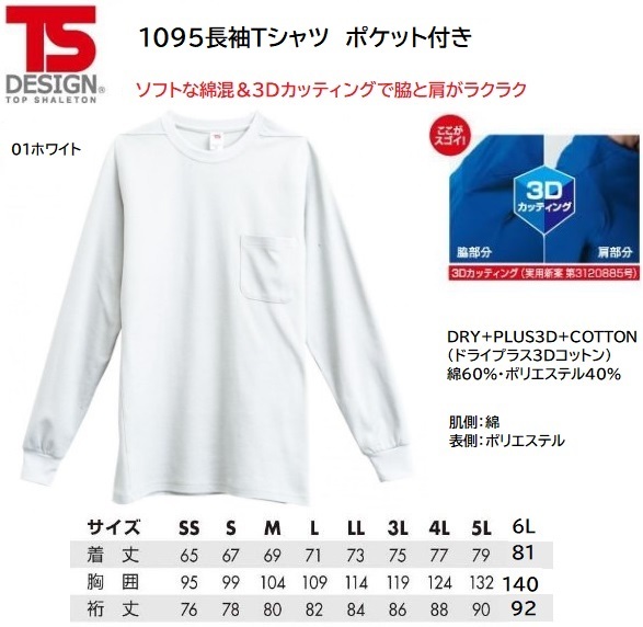 [ネコポス発送/1枚]★TSDESIGN 1095長袖Tシャツ ポケット付き【01ホワイト・SSサイズ】定価3000程度の品、即決880円!!