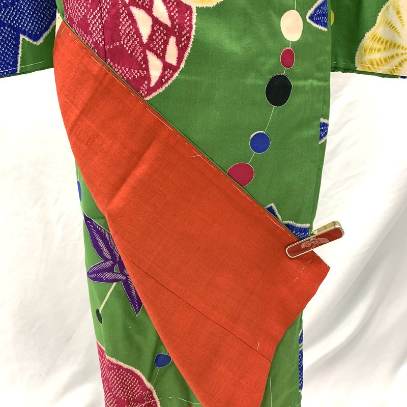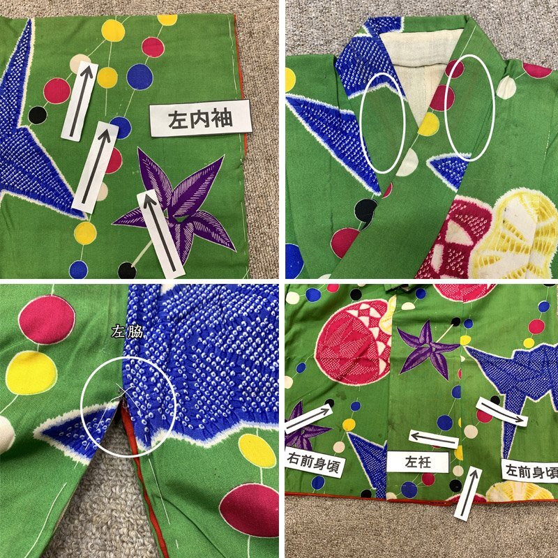 ■アンティーク キッズ着物 三歳 四歳 女児 着物&兵児帯■良好 (No.n) こちらの商品はお着物とおまけでお付けしております兵児帯のセットです(長襦袢やベレー帽、ブーツなどの小物はセットに含まれません)。人気のアンティーク着物です。綺麗なお色の地に鹿の子文様の鞠や折り鶴などが染られたモダンなお着物セットです。ゆとりのあるふくよかサイズです。 お正月やお節句、ご兄弟の七五三の付き添いコーデなどにいかがでしょうか? (着物)胴裏、右前身頃の裾にシミがございますが、お着付けをすると隠れる部分です。左右衿、左内袖にある様なシミが他にもございますが、遠目で見るとあまり目立ちません。左脇にほつれがございますが、お着付けをすると隠れる部分です。 (長襦袢)こちらには長襦袢が付属いたしません。代わりにお子様の負担が少なく、便利な子ども用楽々衿をお勧めします。#ag楽々衿 (帯)おまけで兵児帯をお付けします。 【素材】(着物)正絹 【色】常盤緑 *モニターによって色味は実際と異なる場合がございます。 【サイズ】(着物) 裄:49.8cm、肩上げ:3.7cm、袖幅:30cm、袖丈:42.7cm、丈(肩から):107.6cm、腰上げ:0cm、前幅:20.5cm、後幅:26cm *素人採寸のため、多少の誤差はご容赦ください。 アンティーク着物で古い物ですので、それなりのシミや汚れ、ほつれなどダメージ等あるかと思います。現在出回っているアンティーク着物はシミやアクなどのダメージや手直しなど難がある事の方が多いです。多少の目立たないシミやアクに関しては記載をしておりませんので、ご了承ください。新品同様の綺麗さをご希望の方、少しのシミやアク、ほつれなどアンティークに御理解頂けない方のご購入はお控えいただきますよう、お願いします。 |