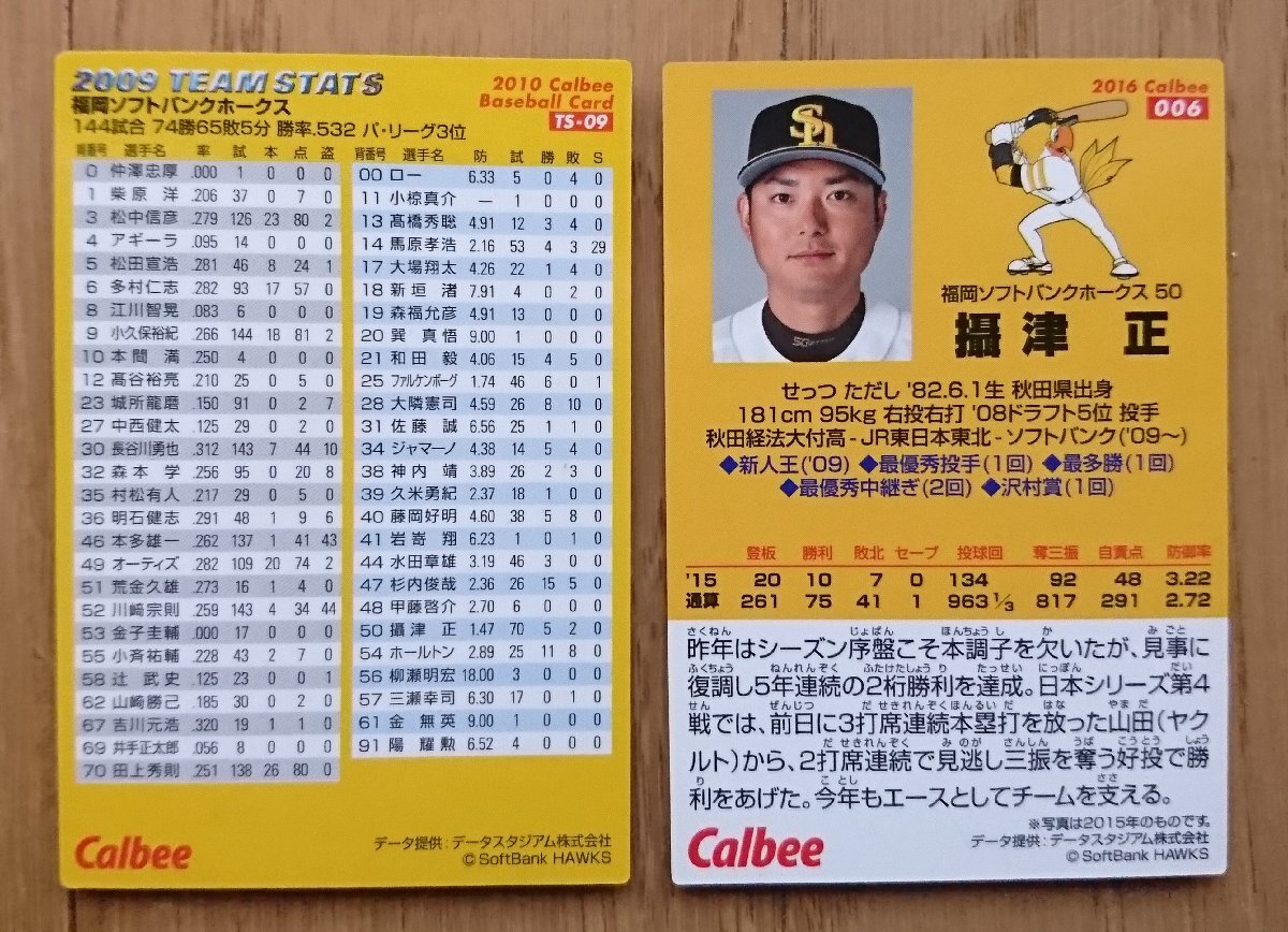 【カード・カルビー】攝津正 2010年TS-09 チームスタッツ / 2016年006 計2枚セット 福岡ソフトバンクホークス カルビープロ野球チップス