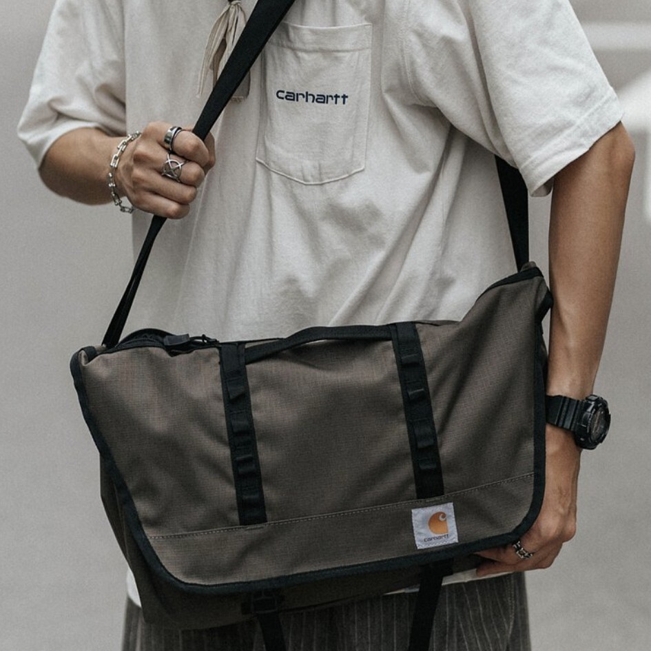 人気ブランド『Carhartt』の、カーハートのメッセンジャーバッグです。整理整頓できる大きなメインコンパートメント、後ろ側には2つのメッシュジッパー式ポケットがついている収納力に優れた造りになっています。