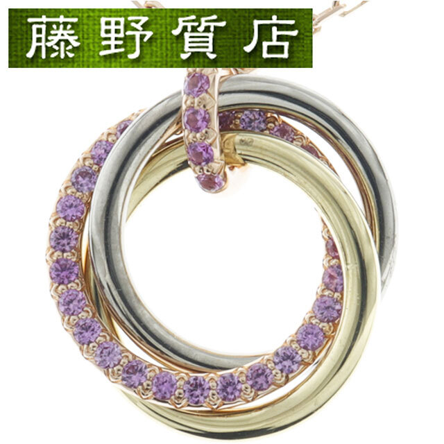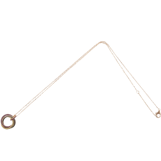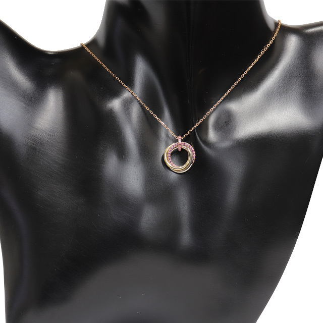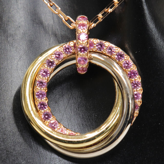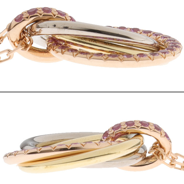 コメント | スリーカラーのゴールドを使用した、カルティエの代表的コレクションのトリニティネックレスです。ピンクサファイヤがひとつのリングにフルセッティングされております。 |