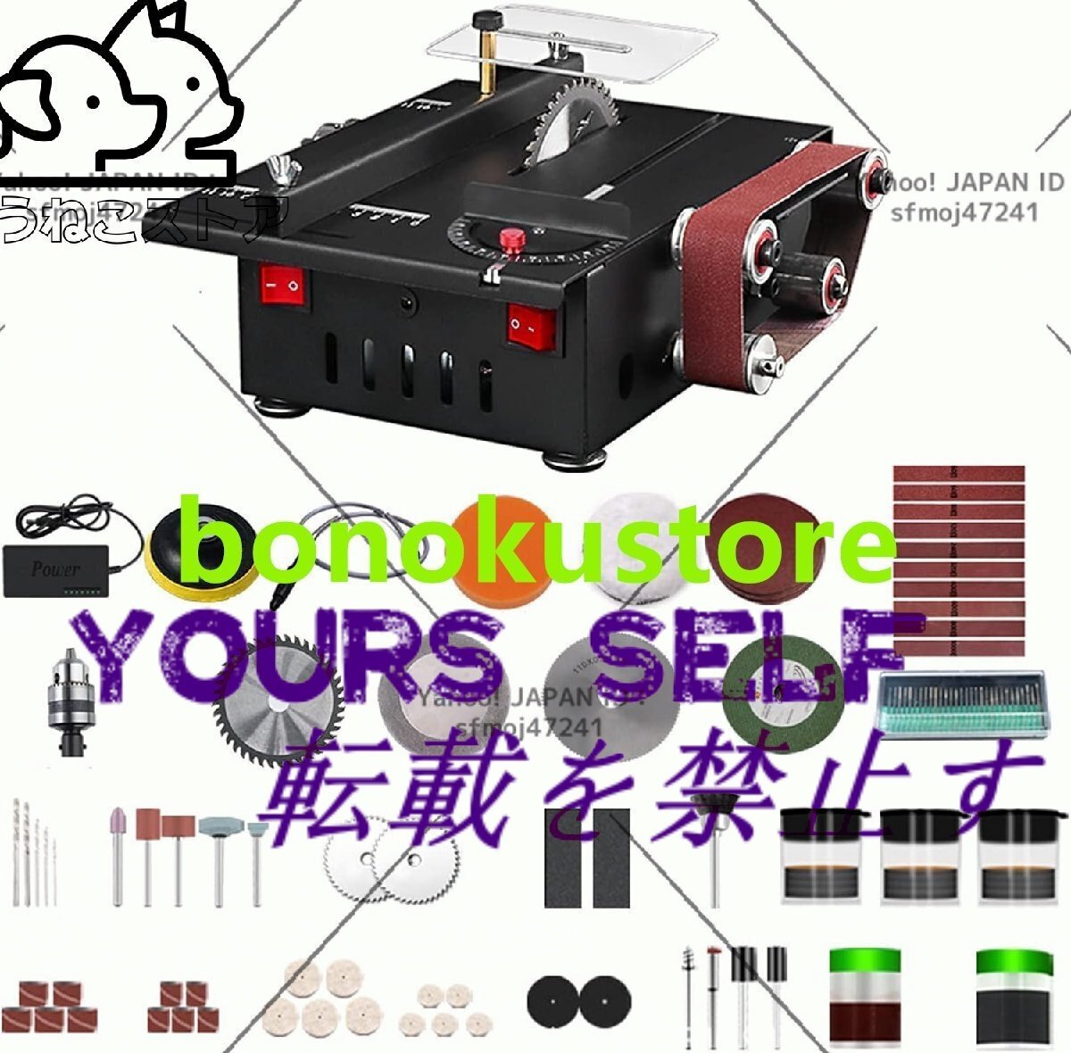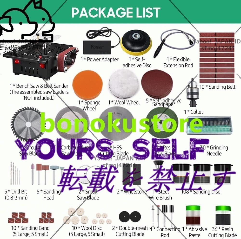 ベンチソーとベルトサンダーの2in1機能。タイプ 1 には、丸鋸刃と 10 本の研磨ベルトが装備されています。タイプ2には、のこぎり、切断、研磨、研削、彫刻、および穴あけのための豪華なアクセサリーが装備されています.