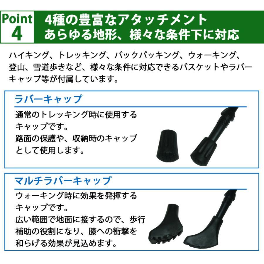 ![]() ![]() ![]() ![]() ![]() ![]() LandFieldの伸縮式トレッキングポールは、ハイキング、トレッキング、バックパッキング、ウォーキング、登山、雪道歩き、などのあらゆる冒険・旅行の心強いお供になります。 軽量設計なので使用していても疲れにくく、使用しない時は収縮してバックパックに簡単に収納できます。 登山などの不安定な足場でも安心安全に、体にかかる負担を軽減して、より長く、より楽しい歩行をサポートします。 ■カーボンファイバー製ポール 軽量さと強さを兼ね備えた丈夫な素材 カーボンファイバーは、鉄と比較すると比重で1/4、比強度で10倍、比弾性率が7倍あります。 その他にも、耐摩耗性、耐熱性、熱伸縮性、耐酸性、電気伝導性に優れているという特性があります。 カーボンファイバーは、衝撃吸収素材でもあるため、素材そのものの力でジョイント部への衝撃を差異上限に抑え、騒音を吸収します。 またポールジョイント部に金属を使用していませんので、錆のせいでくっついてしまうということはありません。 ■コルクグリップを採用 湿気を吸収し、手にしっかり馴染む コルクは湿気を吸い込み、手のひらに汗をかいても滑りにくい素材です。 また、グリップの形状は手の形に合うように設計されているため、つかんだ時にフィットします。 長時間のハイキングでもグリップを快適な乾いた状態に保ちます。 耐久性があり、時間と共に自分の手の形に馴染んできます。 ■フリップロック式で長さ調節が簡単 (長さ調節範囲は約63〜135cm) フリップでロック・解除を行うので簡単に、そして確実に固定することができます。 手袋を付けたままでもワンタッチで操作が可能で、女性や子供でも簡単に操作できます。 フリップの反対側のネジを緩めたり締めたりすることでフリップの固さを調節できますので、適度に調節を行ってください。 ■凹凸型のEVA製延長グリップ 使用場所によって臨機応変な対応 様々な地形に迅速に対応できるようコルクグリップの下に延長 グリップを付けています。 頻繁に起伏が入れ替わる地形、急に変化する地形には延長グリップ を使うと便利です。 ■4種の豊富なアタッチメント あらゆる地形、様々な条件下に対応 ●ラバーキャップ 通常のトレッキング時に使用するキャップです。 路面の保護や、収納時のキャップとして使用します。 ●マルチラバーキャップ ウォーキング時に効果を発揮するキャップです。 広い範囲で地面に接するので、歩行補助の役割になり、膝への衝撃を和らげる効果が見込めます。 ●スノーバスケット 積雪の上でトレッキングする際に私用します。 ポールが雪に埋まることがなく、スムーズに歩行できます。 ●マッドバスケット ぬかるんでいる地面に効果を発揮します。 ぬかるみにポールが沈みにくくなりスムーズに歩行できます。 ■収納袋にコンパクトに収納可能 使用しない時は収納袋に入れてコンパクトに持ち運べます。 リュックに入れてもかさばらずに収納可能。 | ||||||||||||