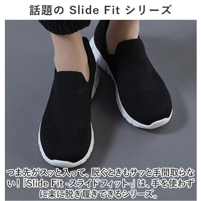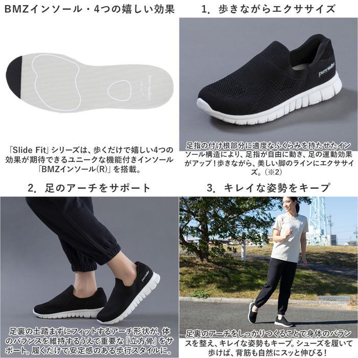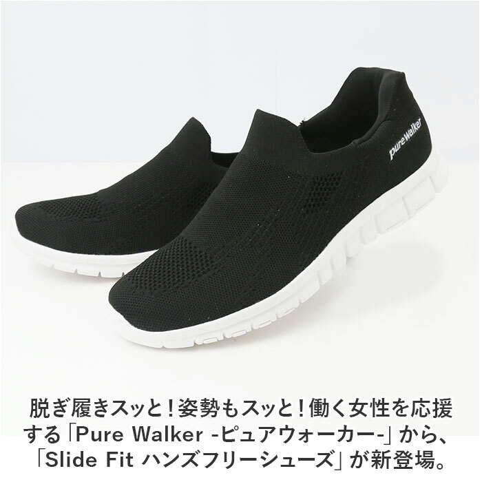 | 商品説明 | ・・脱ぎ履きスッと!姿勢もスッと!働く女性を応援する「Pure Walker -ピュアウォーカー-」から、「Slide Fit ハンズフリーシューズ」が新登場。 ・【話題の Slide Fit シリーズ】 ・つま先がスッと入って、脱ぐときもサッと手間取らない!「Slide Fit -スライドフィット-」は、手を使わずに楽に脱ぎ履きできるシリーズ。 ・【ハンズフリーでスッと脱ぎ履き】 ・滑らかなかかとのカップ形状が足入れをサポート!しゃがんだり身体を屈める必要がなく、ハンズフリーで脱ぎ履き楽ちん。 ・【通気性抜群のニット素材】 ・アッパー生地は、通気性の高いニット素材を目の細かいメッシュ状に編み上げ、真夏でも足元はサラリと快適。 ・【ふわっと軽い履き心地】 ・シューズ片足分の重量はわずか約180g。履いていることを忘れてしまうほどの軽い履き心地で、軽快なフットワークを実現(※1)。 ・【BMZインソール・4つの嬉しい効果】 ・・「Slide Fit」シリーズは、歩くだけで嬉しい4つの効果が期待できるユニークな機能付きインソール「BMZインソール(R)」を搭載。 ・【1.歩きながらエクササイズ】 ・足指の付け根部分に適度なふくらみを持たせたインソール構造により、足指が自由に動き、足の運動効果がアップ!歩きながら、美しい脚のラインにエクササイズ。(※2) ・【2.足のアーチをサポート】 ・足裏の土踏まずにフィットするアーチ形状が、体のバランスを維持するうえで重要な「立方骨」をサポート。履くだけで安定感のある歩行スタイルに。 ・【3.キレイな姿勢をキープ】 ・足裏のアーチをしっかりつくることで身体のバランスを整え、キレイな姿勢もキープ。シューズを履いて歩けば、背筋も自然にスッと伸びる! ・【4.歩行による肩腰の疲労軽減】 ・今までの歩行スタイルを正しいバランスに導くことで、身体の緊張を緩和し、肩・腰の疲れが軽減(※3)。お買い物や散歩など普段のちょっとした歩行から健康に。 ・【楽ラク!スリッポンスタイル】 ・くつ紐を結ぶ手間がなく、足を滑り込ませるだけで履けるラクラクスリッポンスタイル。 |