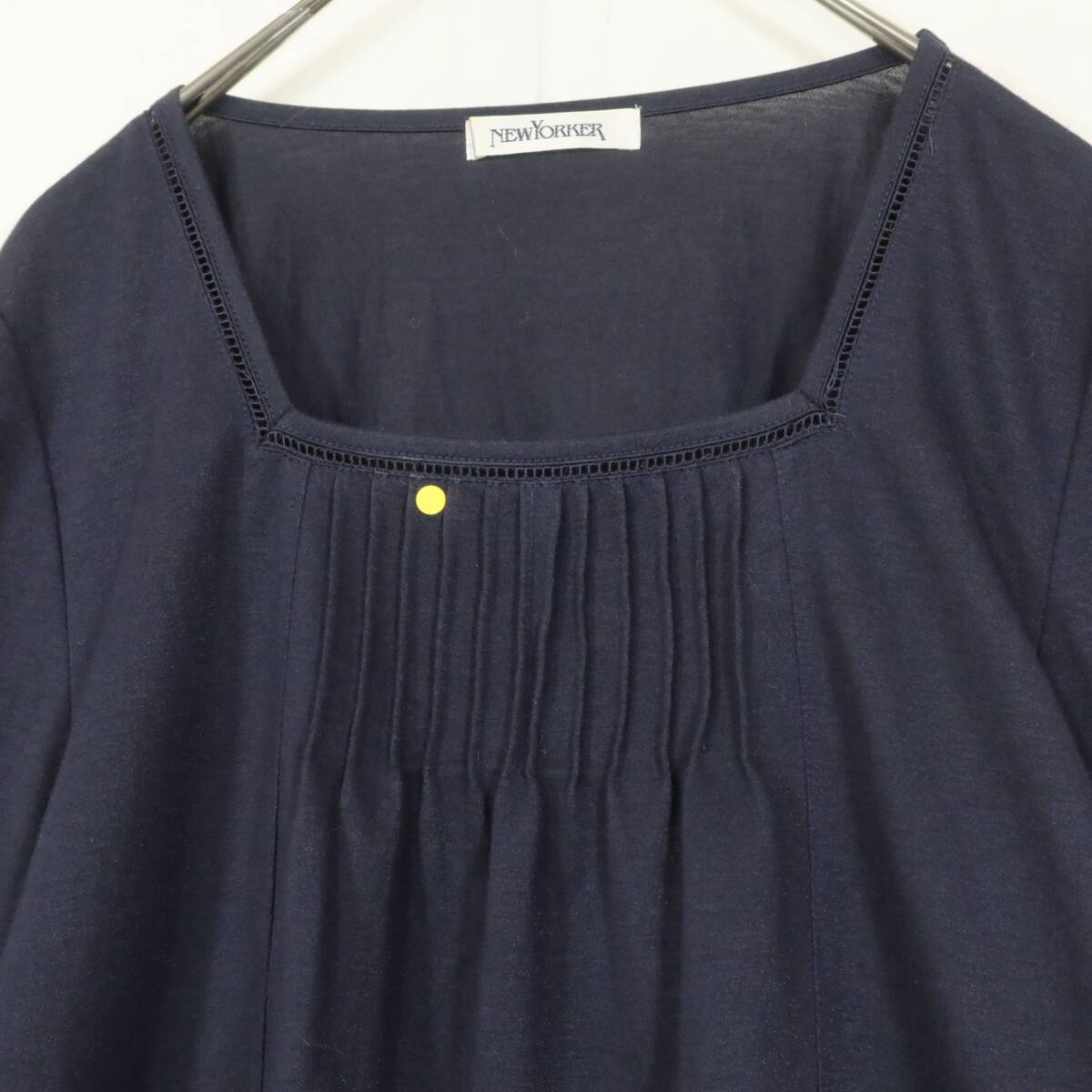 | 商品説明 |                  【実寸約】肩幅35袖丈44バスト84着丈66(cm) 【サイズ表記】 M 【素材】コットン58ナイロン42 【状態】普通の使用感のあるお品物 スレ感少々あり 【デザイン】濃紺系 ふんわりフォルムの七分袖ブラウスです。 薄手/無地・ピンタック&はしごレース付き  |
