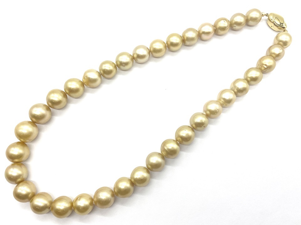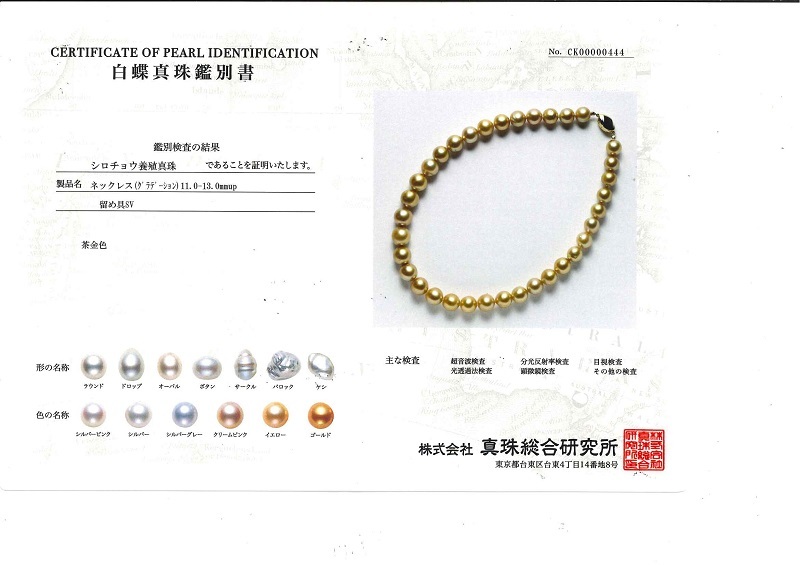 | 仕様 | P=13.0~11.0mm(茶金色/真珠総研) NC45.5 cm 88.0g |