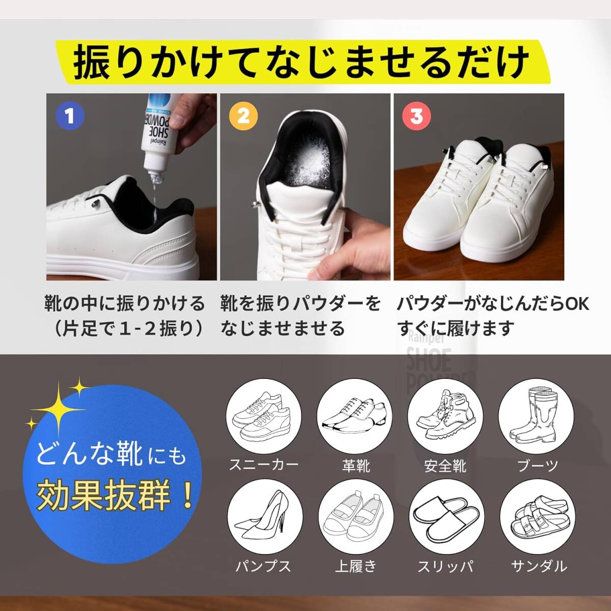 お出かけ前に靴の中に1~2振りし、パウダーを均等に広げるだけ。