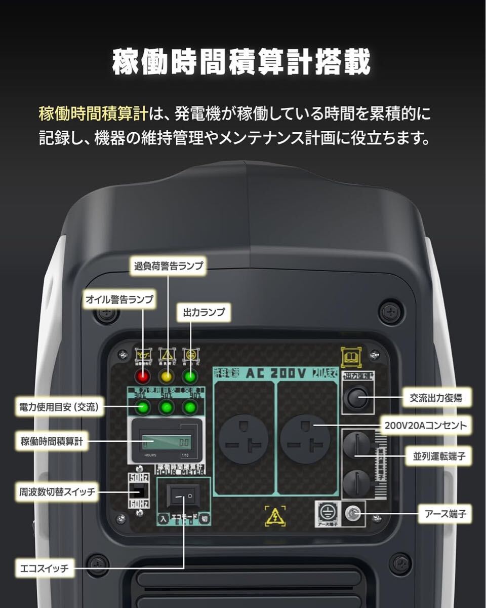 【200V単相インバーター発電機】定格出力2.0KW 専用200Vコンセント2口搭載 (※包装内には専用のプラグが同梱されてて配線はお客様ご自身で接続いただく必要がある。) インジケーター装備三つのランプでどのくらい電気を使用しているかすぐわかります。液晶パネル搭載し累積使用時間も一目で確認できます。