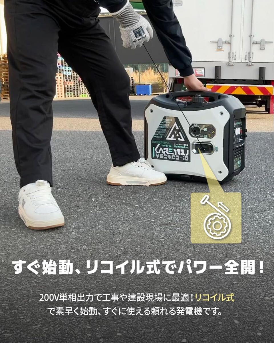【軽量で片手でも持ち運びラクラク】乾燥重量18.5KG小型で軽量な発電機です。車内や作業現場でも邪魔にならず、女性でも楽に持ち運べる設計です。保管時の省スペース化も実現し、キャンプやアウトドアレジャー、各種イベント、災害時にも大活躍する理想的な発電機です。