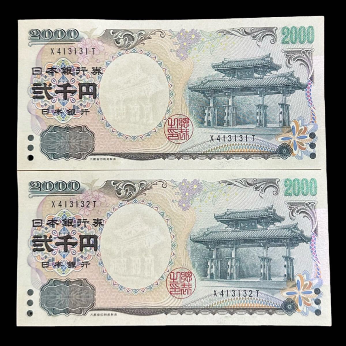 弐千円札 守礼門 源氏物語絵巻 紫式部 ピン札 二千円札 2000円札 日本銀行券D号 2枚連番 アルファベット1桁 連番 X413131T~X413132T 未使用