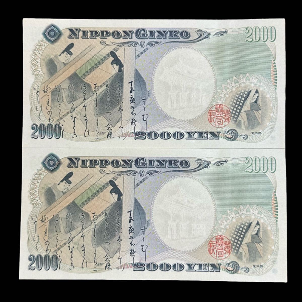 弐千円札 守礼門 源氏物語絵巻 紫式部 ピン札 二千円札 2000円札 日本銀行券D号 2枚連番 アルファベット1桁 連番 X413131T~X413132T 未使用になります。