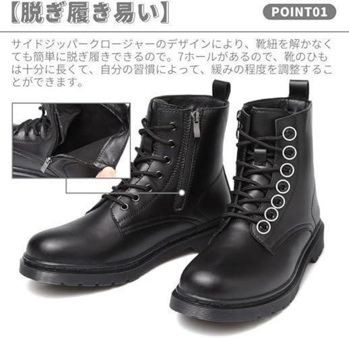 【脱ぎ履き易い】サイドジッパークロージャーのデザインにより、靴紐を解かなくても簡単に脱ぎ履きできるので、忙しい朝や急いでいる時にも便利です。靴の口はひものデザイン方式を採用して、7つの穴があって、緩みの程度を調整することができます。