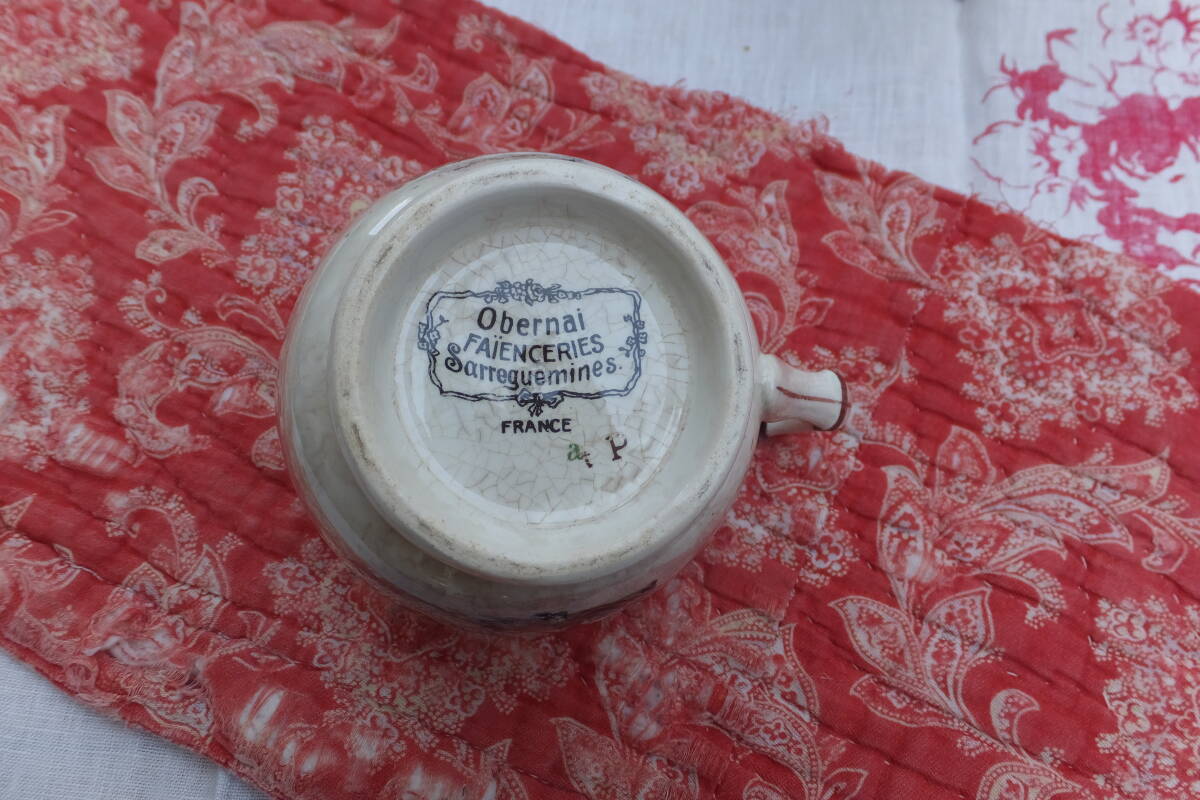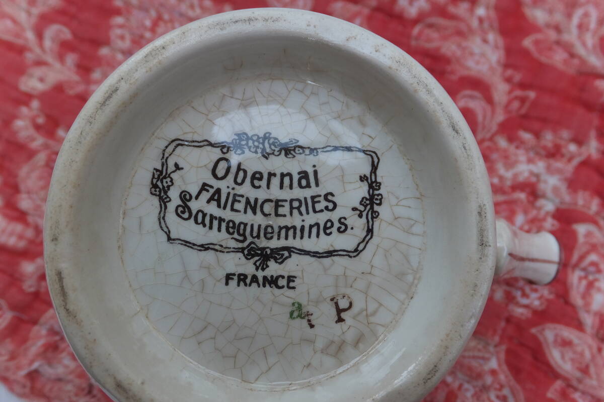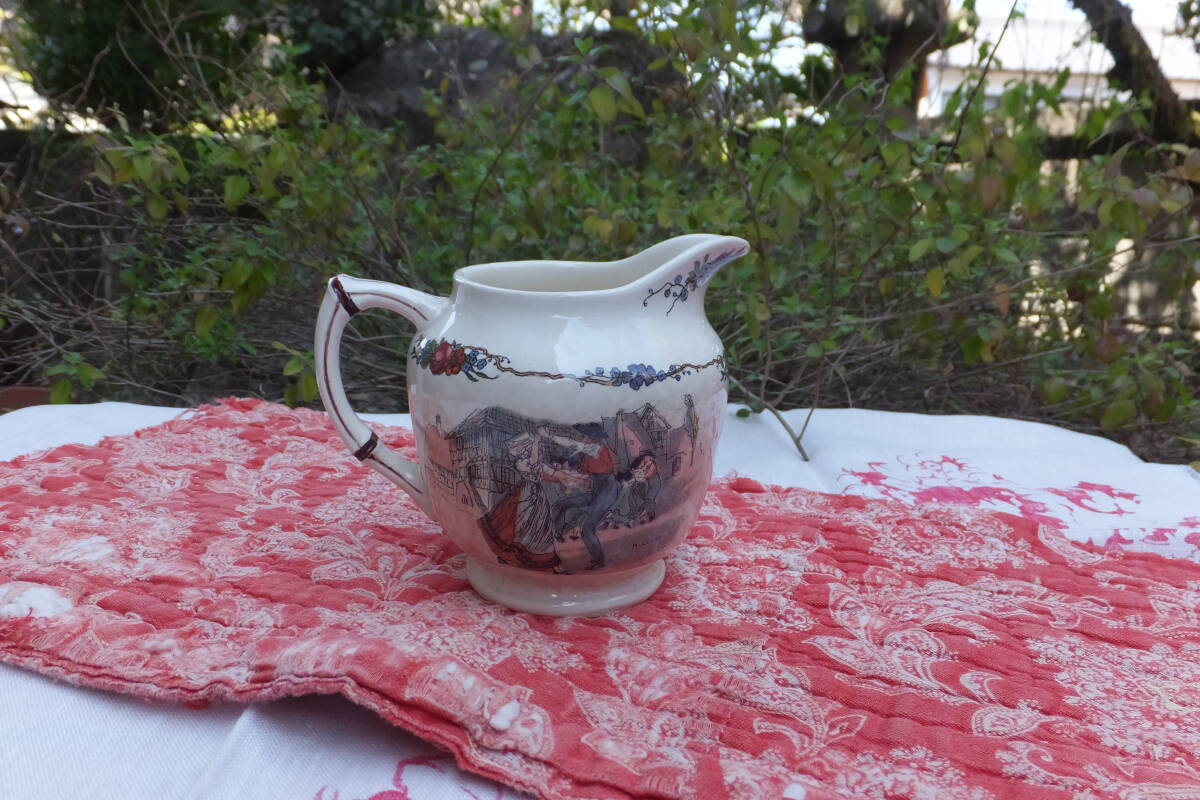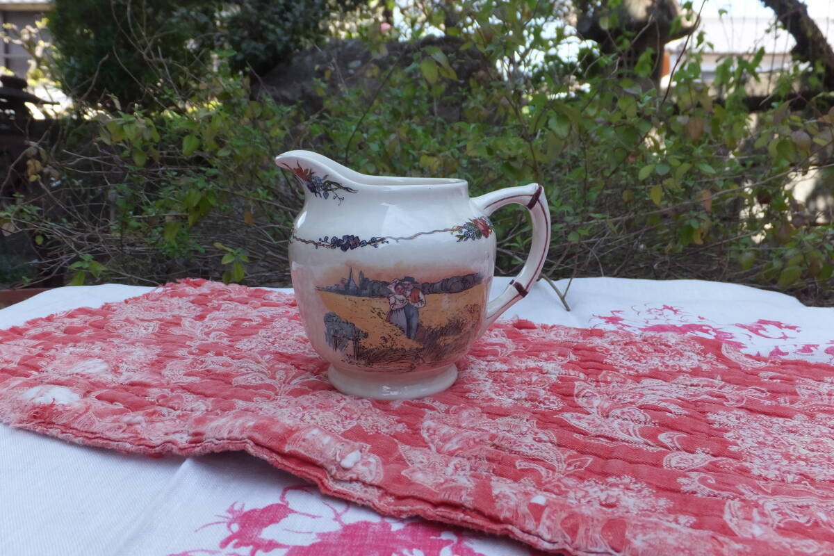 フランスのパリで見つけた古いSarregueminesのObernai Faienceriesのクリーマーです。アルザス地方の民族衣装の男女と田園風景が描かれたたっぷりしたクリーマーですのでお花を生けたり・・・緑を生けたり・・・良い大きさです。カケ等はありませんが絵のない部分に多少シミがあります。french shabby chicです。